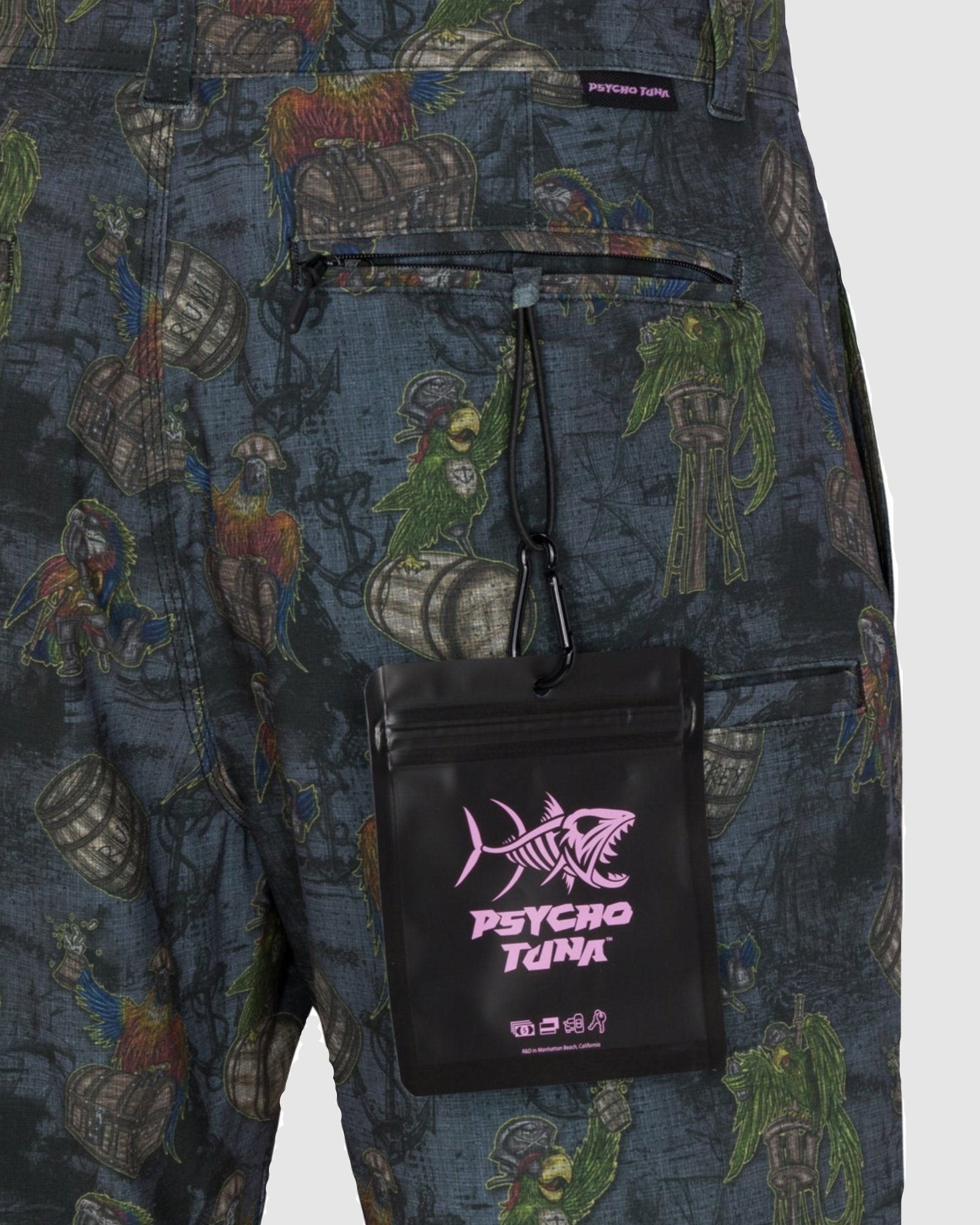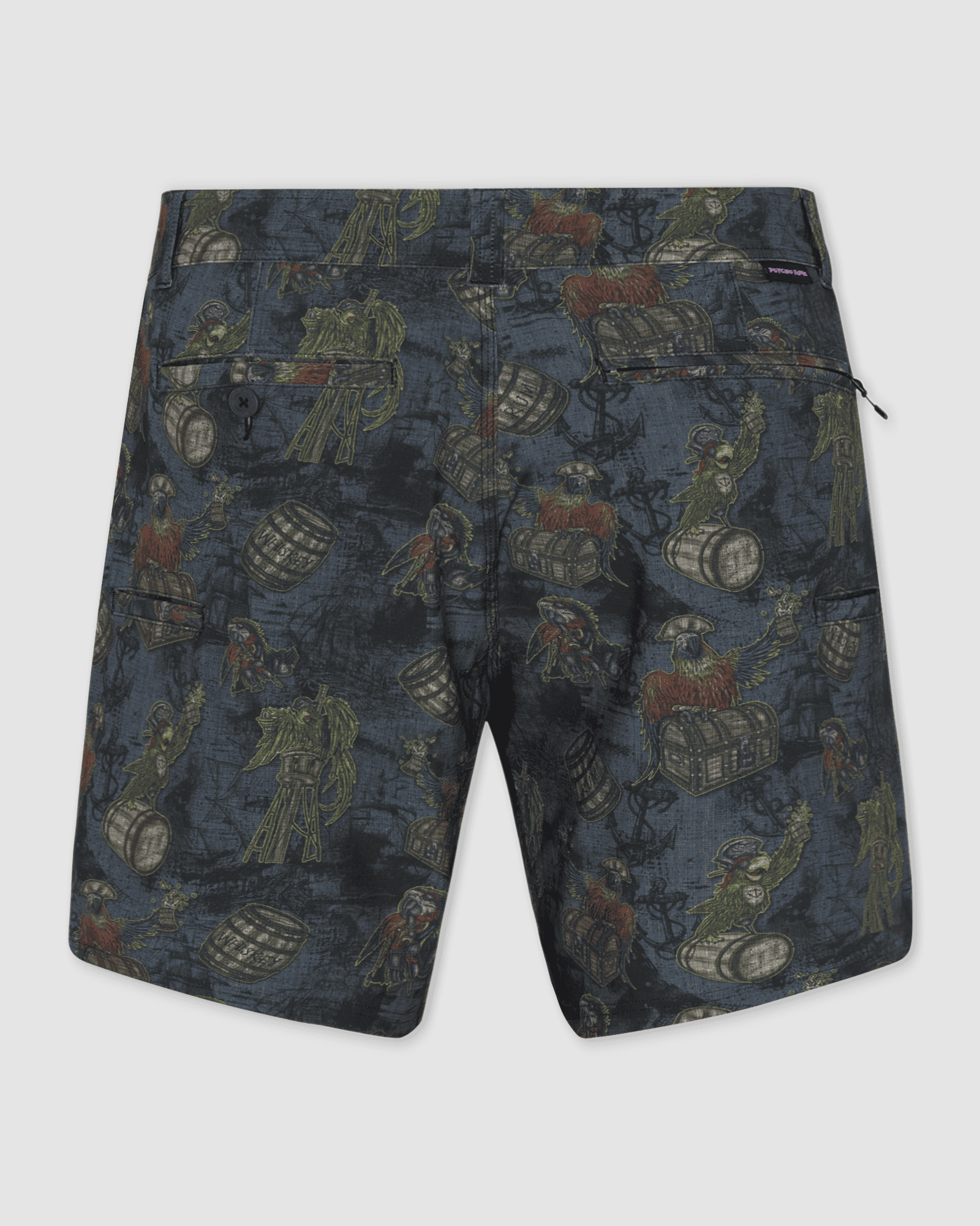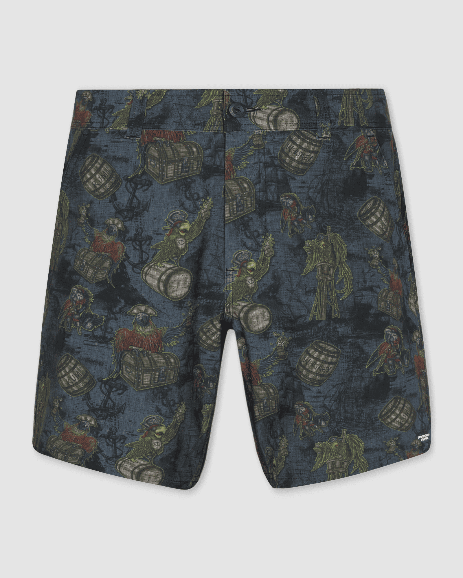 The unique design features an all-over print pattern of parrots, barrels, and treasure chests set against a dark background, adding a touch of the exotic to your beachwear. But these shorts aren’t just about looks. They’re made with a 4-way stretch fabric that moves with you, providing maximum flexibility whether you’re splashing up the water or chilling on the sand.