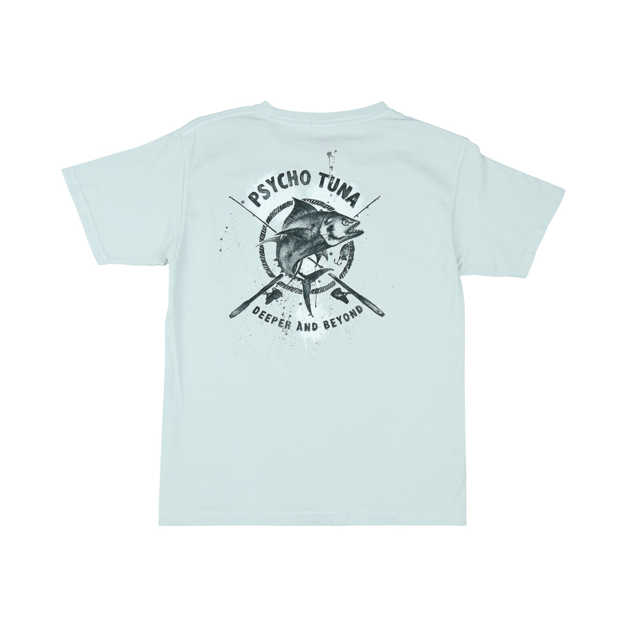 Who is ready to reel in our Deeper and Beyond S/S Graphic Tee. Featuring hand drawn art. Super soft pigment dye. Available in Lt Pink, Lt gray, Pink/Blu tie dye. Screen printed front and back. Made of 100% Cotton. Available in S-M-L-XL-XXL. Made in the USA