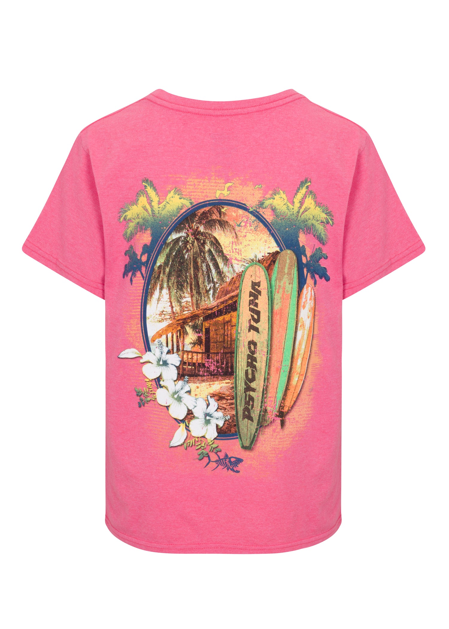 Stylish longboard surf vacation printed Graphic Tee. Short Sleeve. Featuring hand drawn artwork. Super soft pigment dye cotton/polyester. Screen printed front and back.