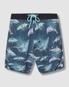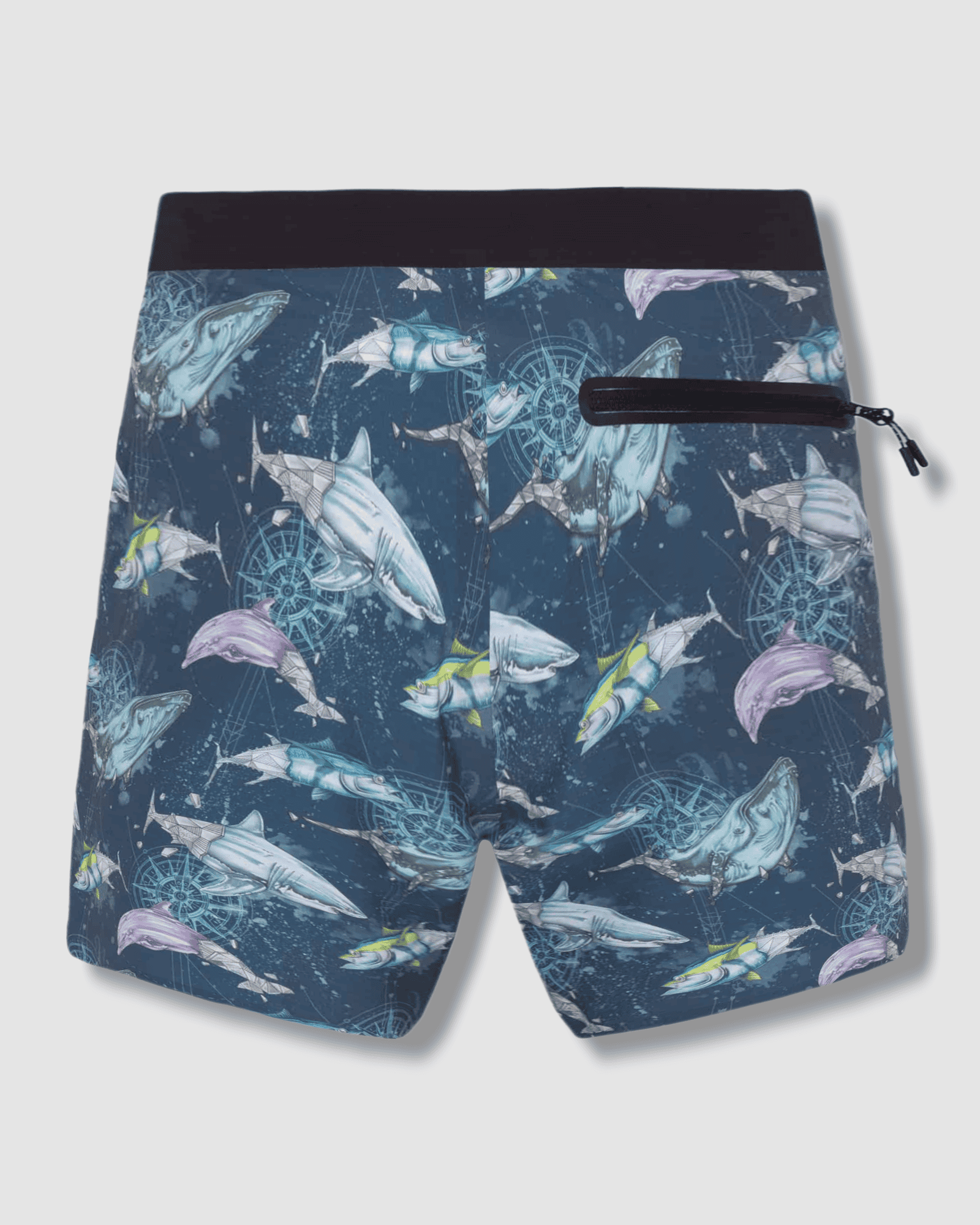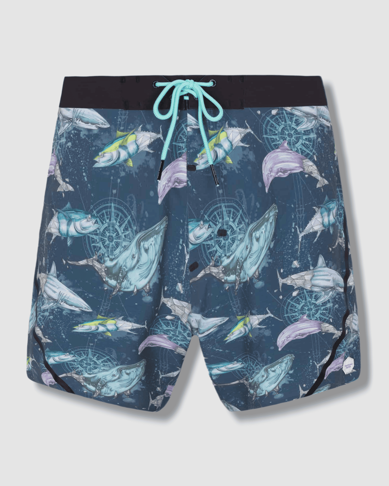 These boardshorts feature an all-over print of original hand-drawn artwork, showcasing majestic whales, swift tunas, and other vibrant ocean dwellers. Set against a dynamic oceanic backdrop, the design is interwoven with compasses, creating a captivating and adventurous pattern that stands out both in and out of the water.
