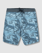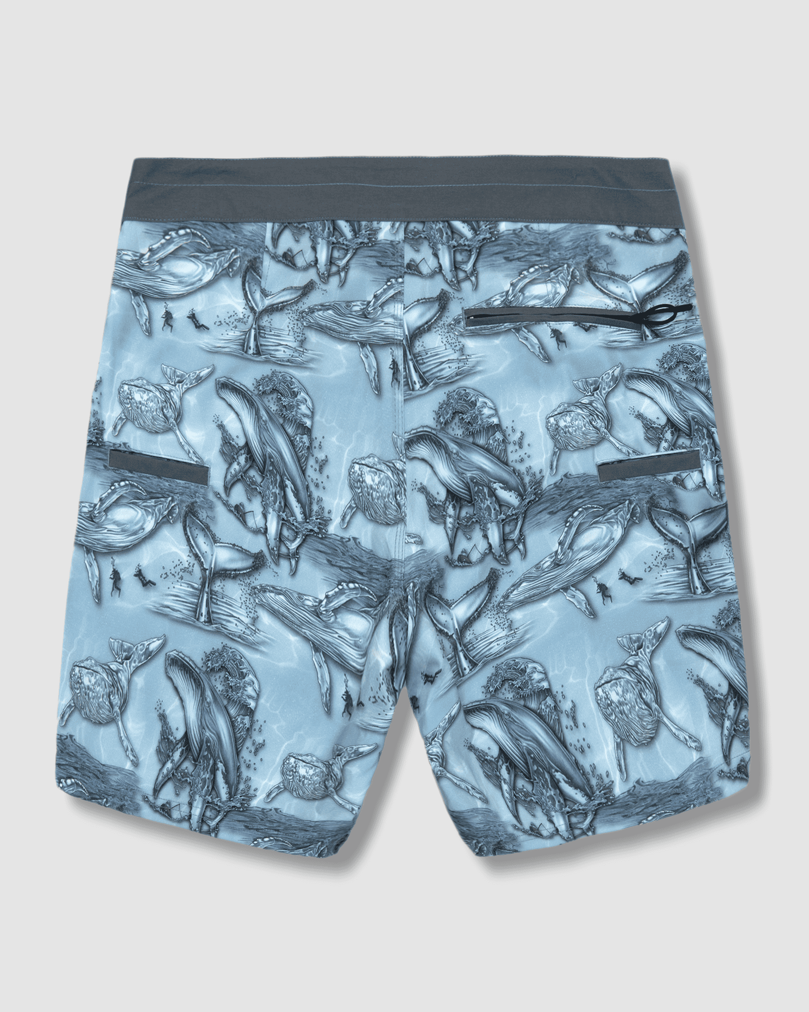 These boardshorts feature an all-over print of hand-drawn graphic artwork, showcasing humpback whales in a breathtaking display. The majestic whales are depicted in a dynamic, oceanic scene, surrounded by vibrant marine life and the serene backdrop of the open sea. The intricate details and vivid colors bring the underwater world to life, making these boardshorts a standout piece for any surf enthusiast.