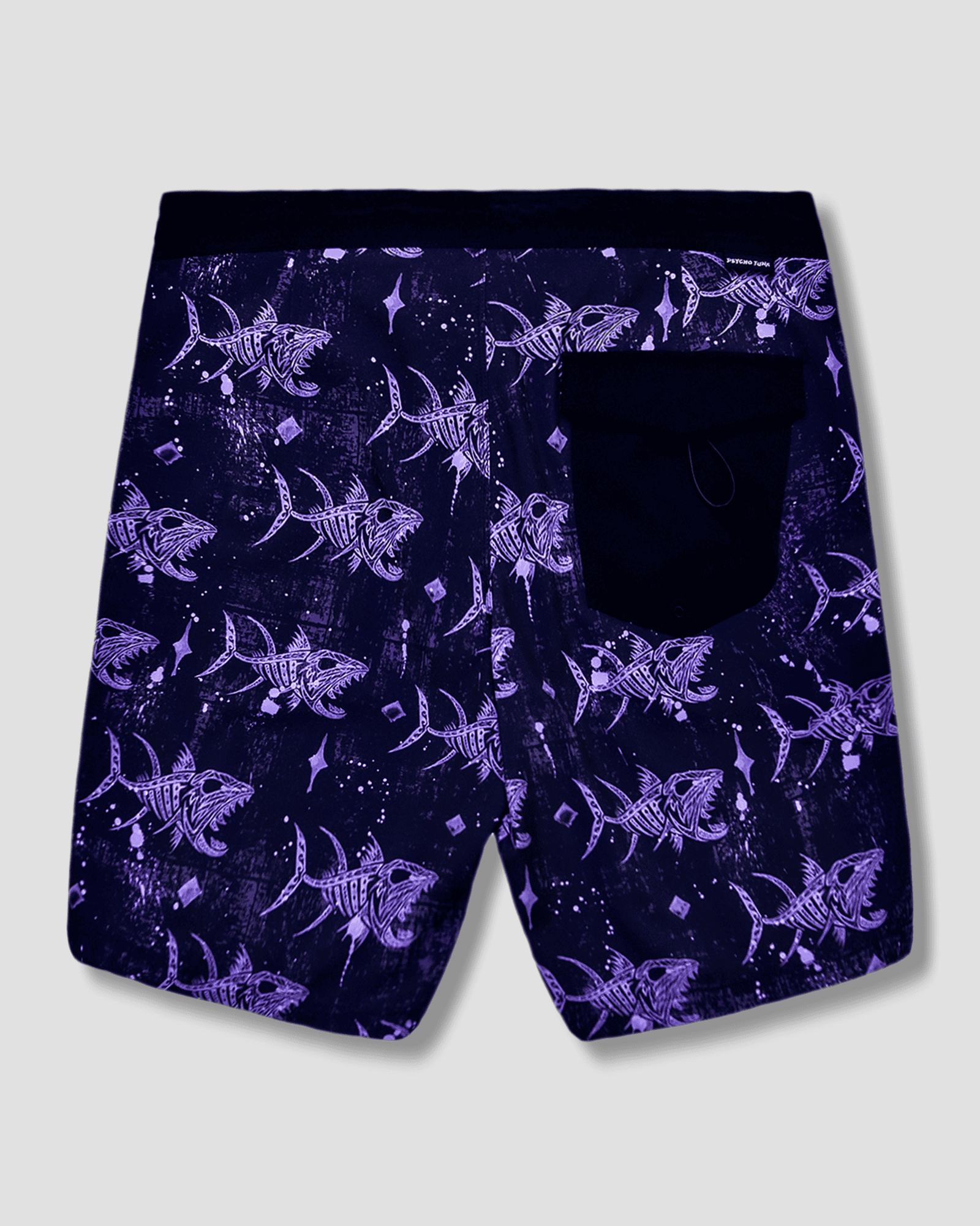 The design showcases the iconic Psycho Tuna logo, a fishbone set against a purple cloudy backdrop, creating a mysterious and slick look that stands out on the beach. Made from high-performance materials, these boardshorts offer durability and comfort, ensuring you stay stylish and agile whether you’re carving up the waves or chilling on the shore.