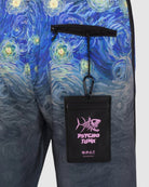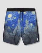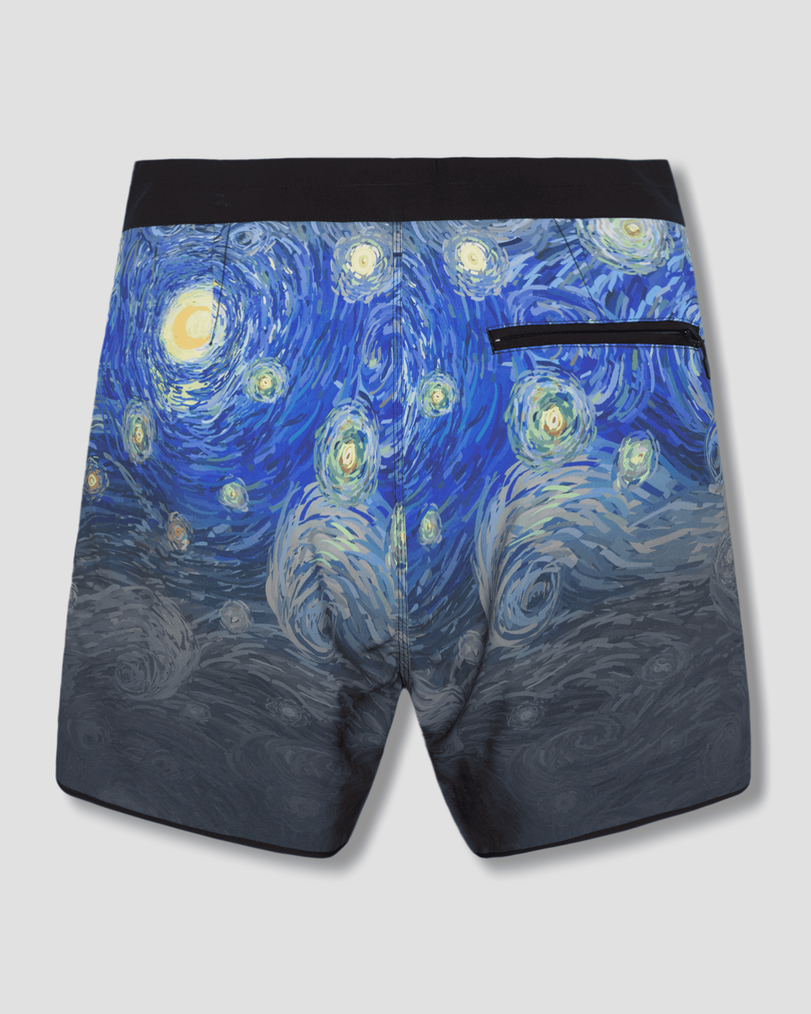 These boardshorts are a true masterpiece, inspired by Van Gogh’s iconic “Starry Night.” The design features swirling, vibrant blues and yellows that cover the entire fabric, creating a mesmerizing effect that captures the essence of the night sky over the ocean. Crafted for both style and performance, these boardshorts offer a perfect blend of comfort and durability, making them ideal for any surf session or beach day.