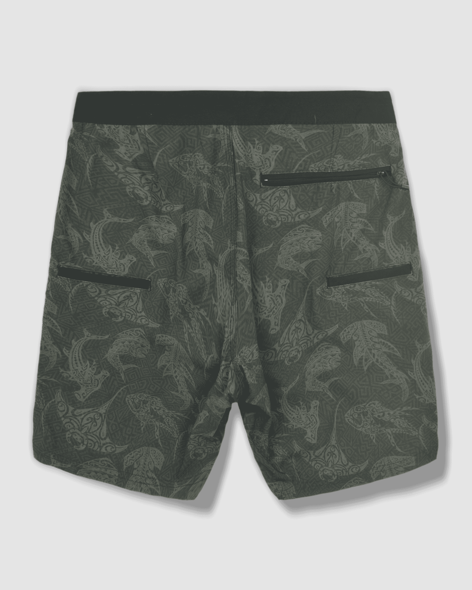 These boardshorts feature an all-over print of original hand-drawn artwork, showcasing hammerheads and stingrays in a striking tribal pattern. The intricate designs blend seamlessly to create a visually captivating and unique look that stands out both on the beach and in the surf. Crafted for comfort and durability, these boardshorts are perfect for any surf session or beach day.