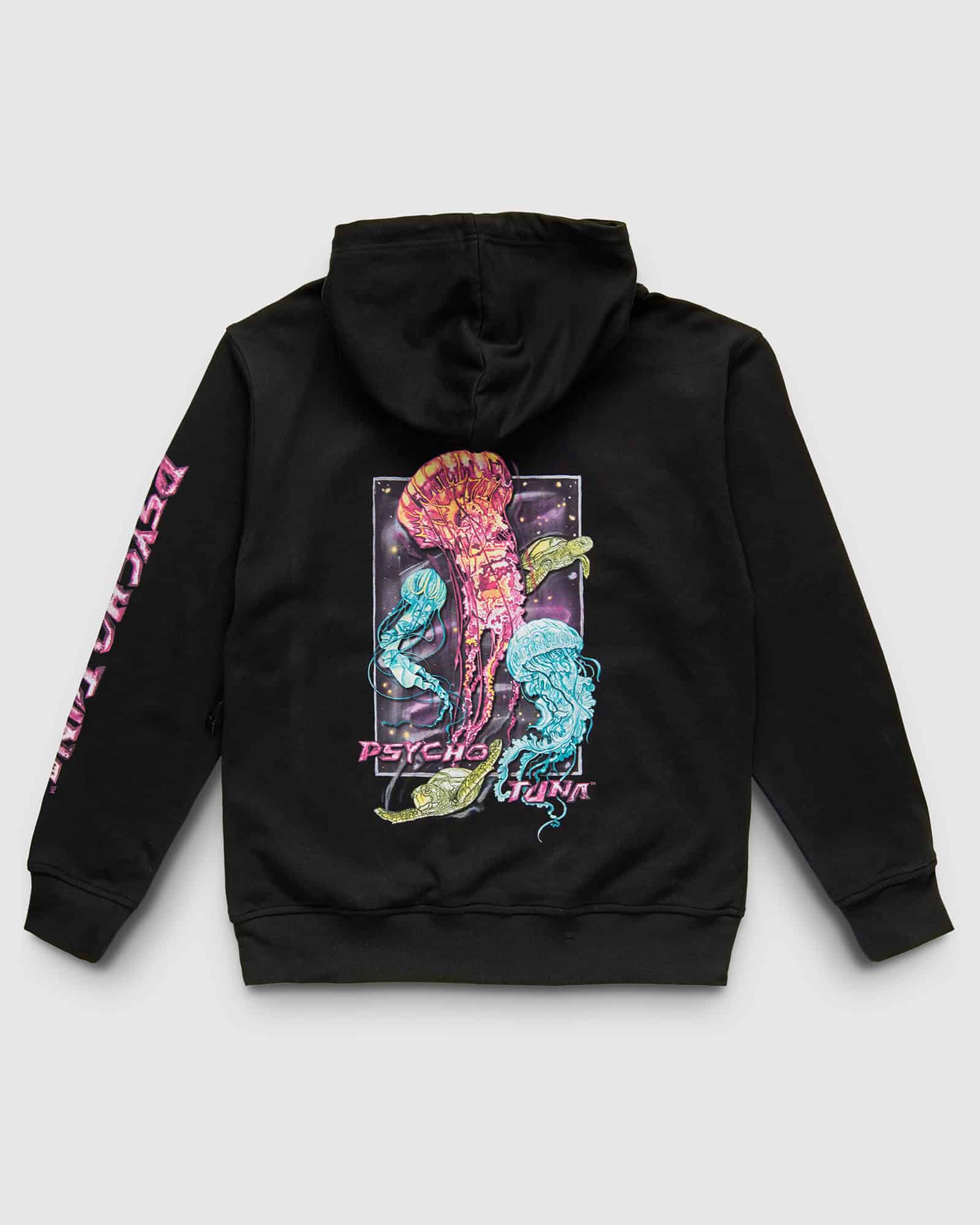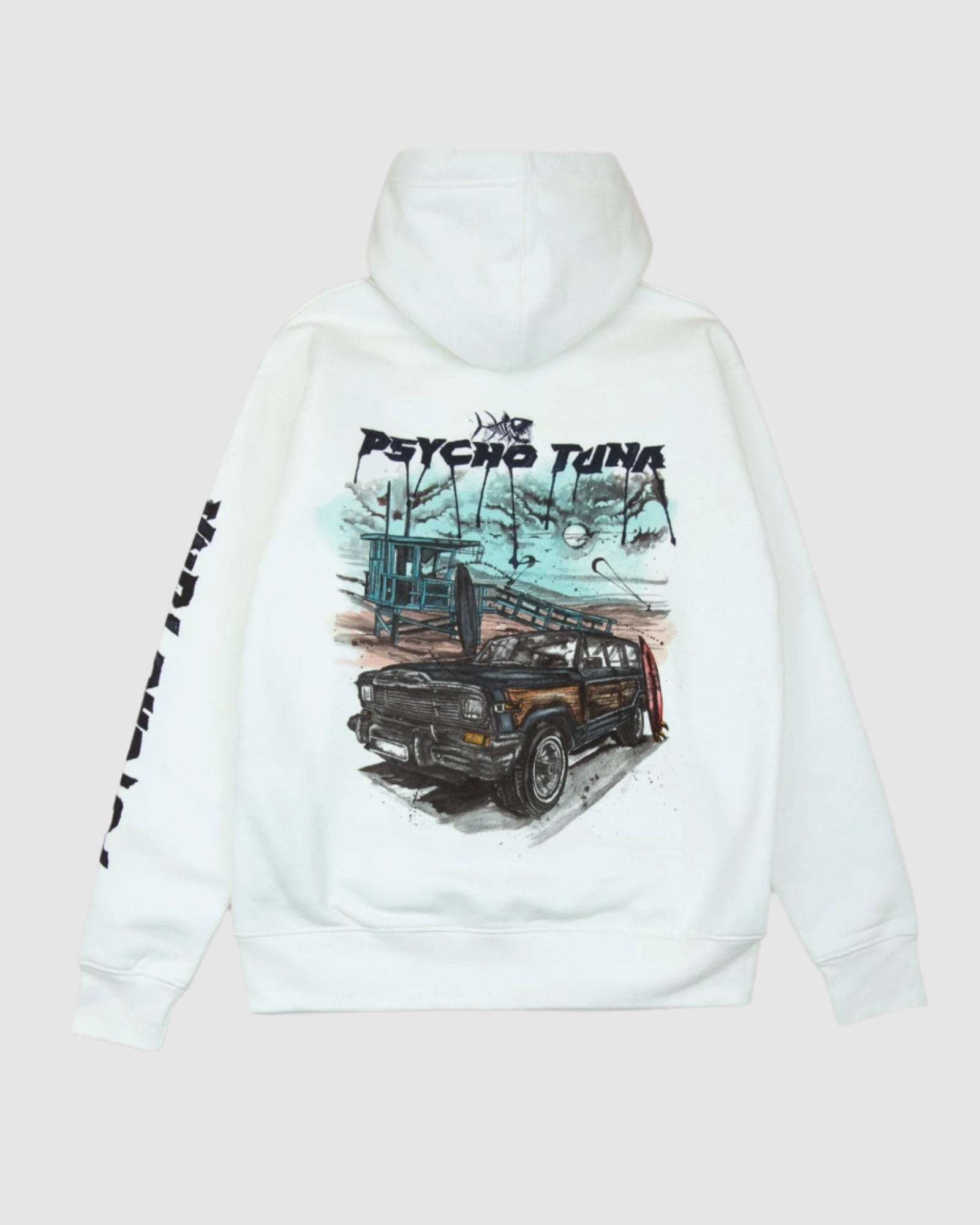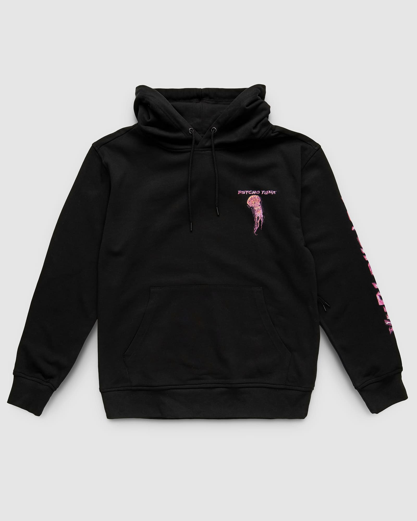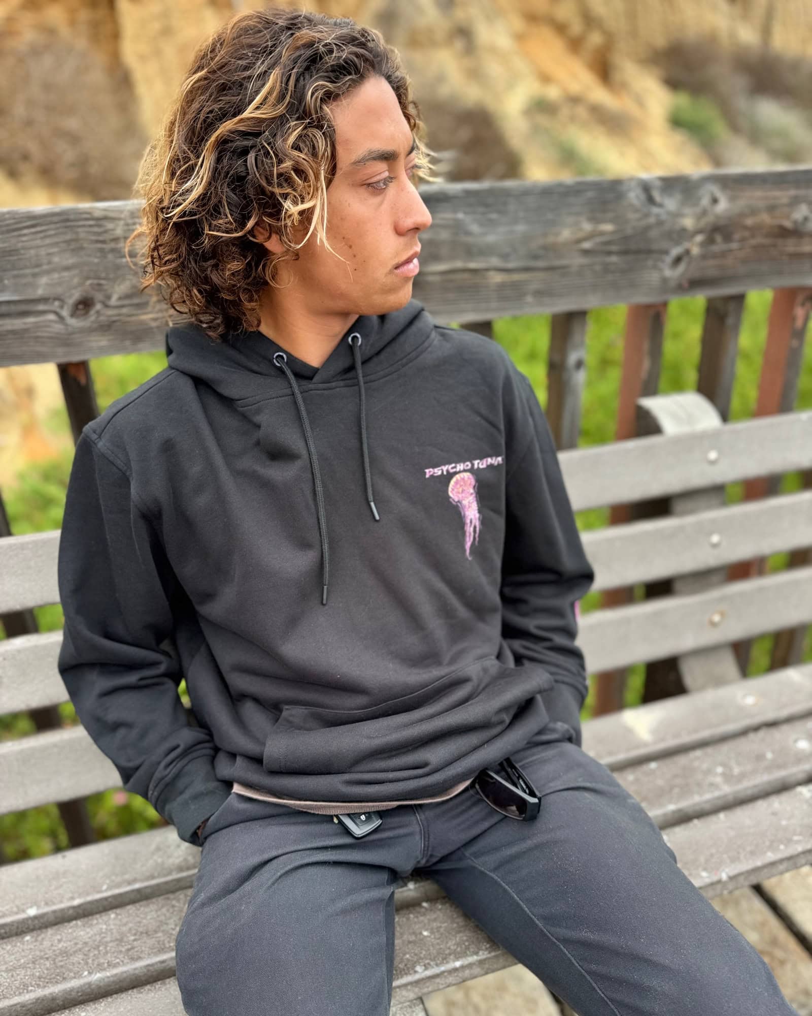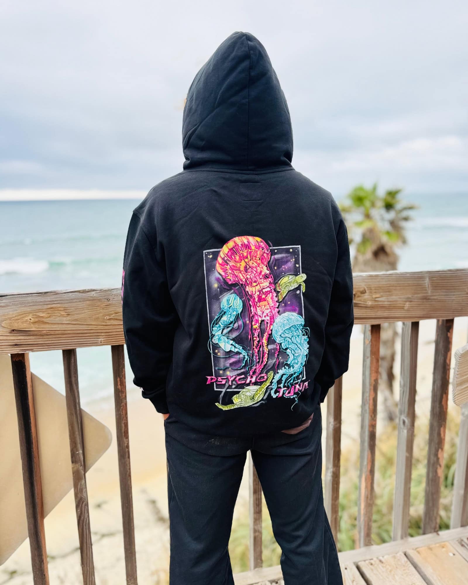 Relax in style with the Psycho Tuna Hoodie. The Psycho Surf babe Hoodie is a classic construction featuring long sleeves and adjustable drawstring hood with bold Psycho Tuna graphic at the back. This hoodie is suitable for exercise and play. It is made of cotton and is machine washable for easy care. This comes in black and lt grey. and is available in sizes S, M, L, XL, and XL are available.