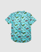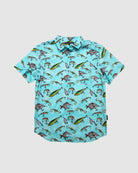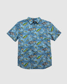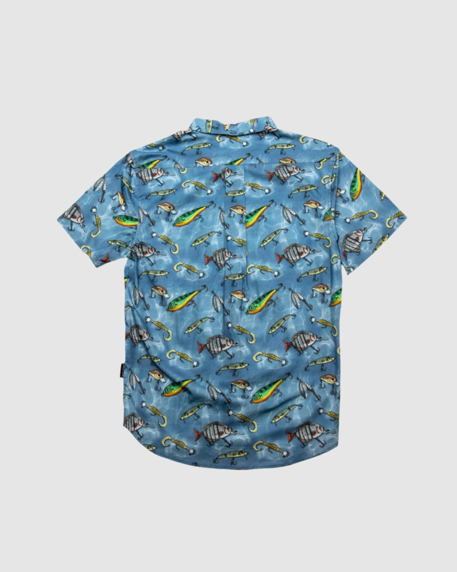 Featuring unique, hand-drawn graphic art of various fishing lures, this shirt is a rad addition to your wardrobe. The fishing lures are set against a backdrop of water ripples, creating an all-over print that’s as cool as the ocean breeze.