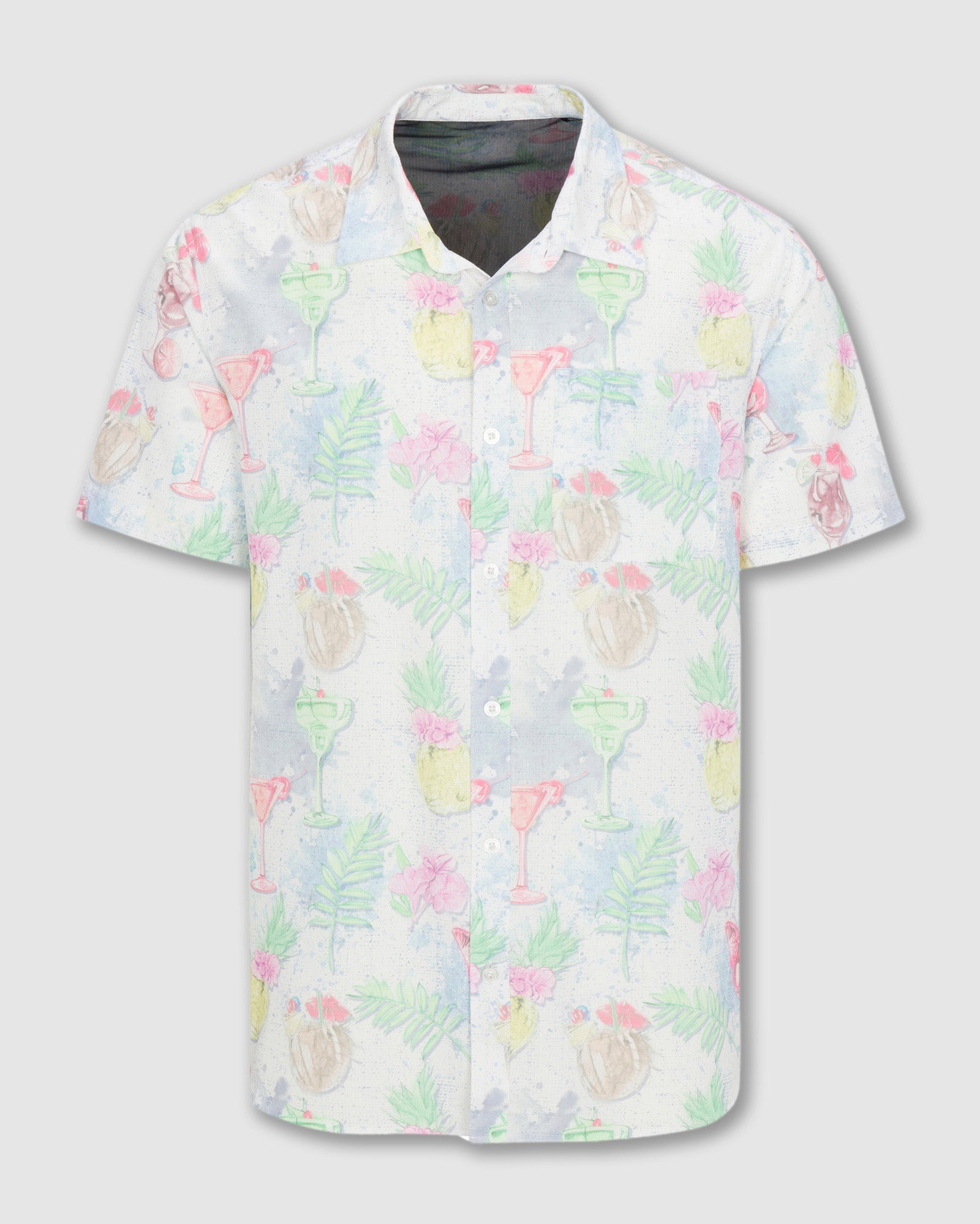 This isn’t just a shirt; it’s a ticket to a beach vacation, no matter where you are. Designed with a chill, all-over print of beach drinks on a pristine white background, it’s a celebration of summer that you can wear.