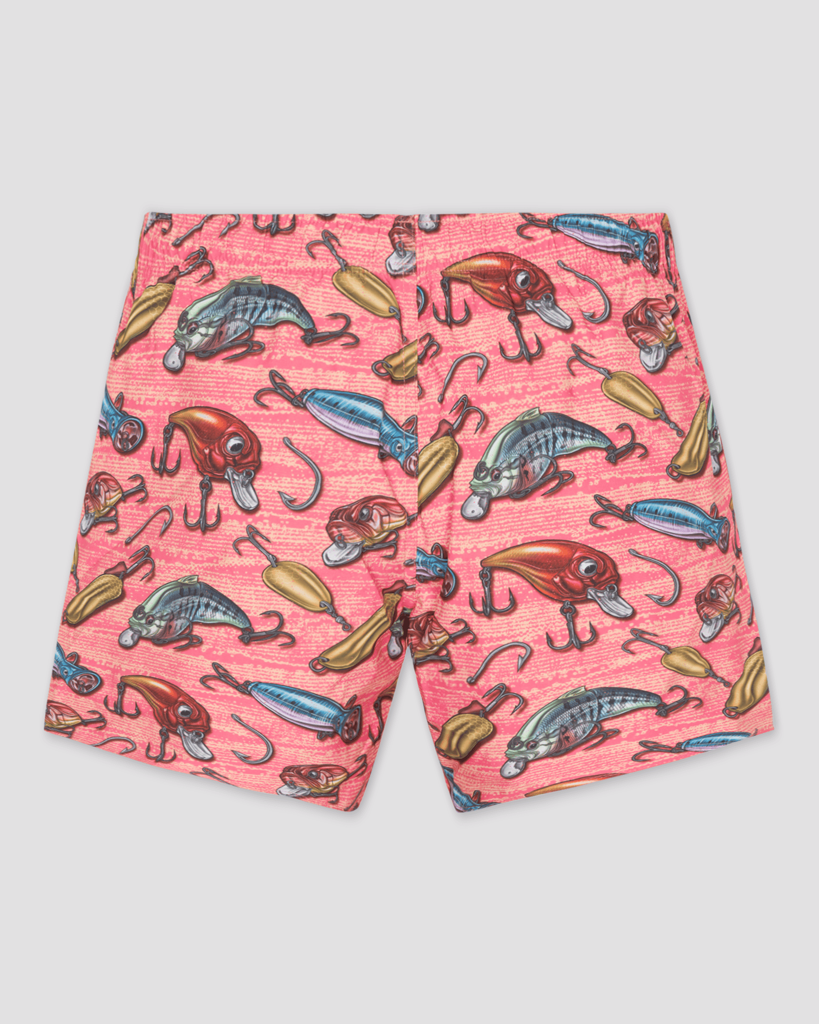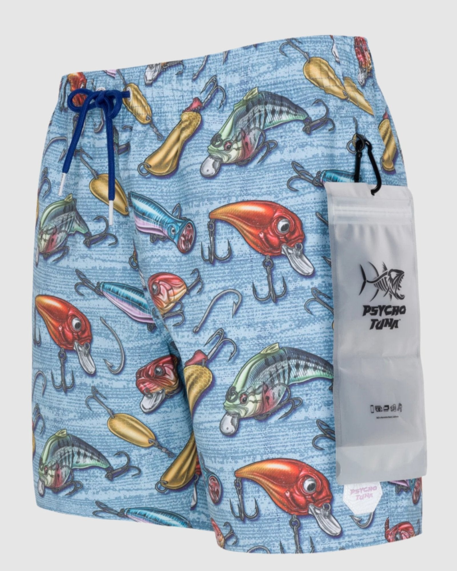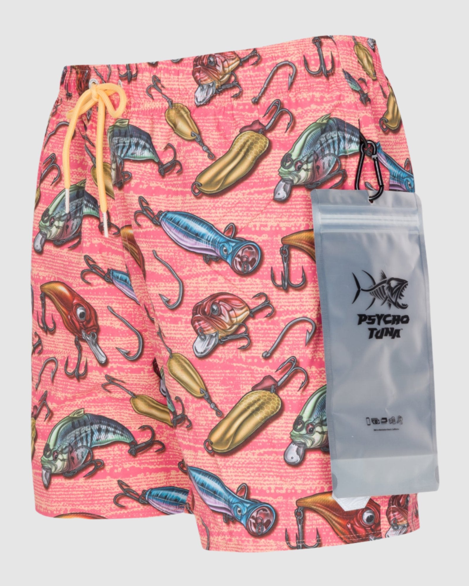 These pool shorts feature an all-over print of original hand-drawn graphic artwork showcasing a variety of fishing lures, each design more eye-catching than the last. The vibrant, detailed illustrations capture the essence of the ocean, making these shorts a standout choice for any beach or poolside adventure. Crafted for comfort and durability, they offer a perfect blend of style and functionality, ensuring you stay cool and look rad while catching waves or lounging in the sun.