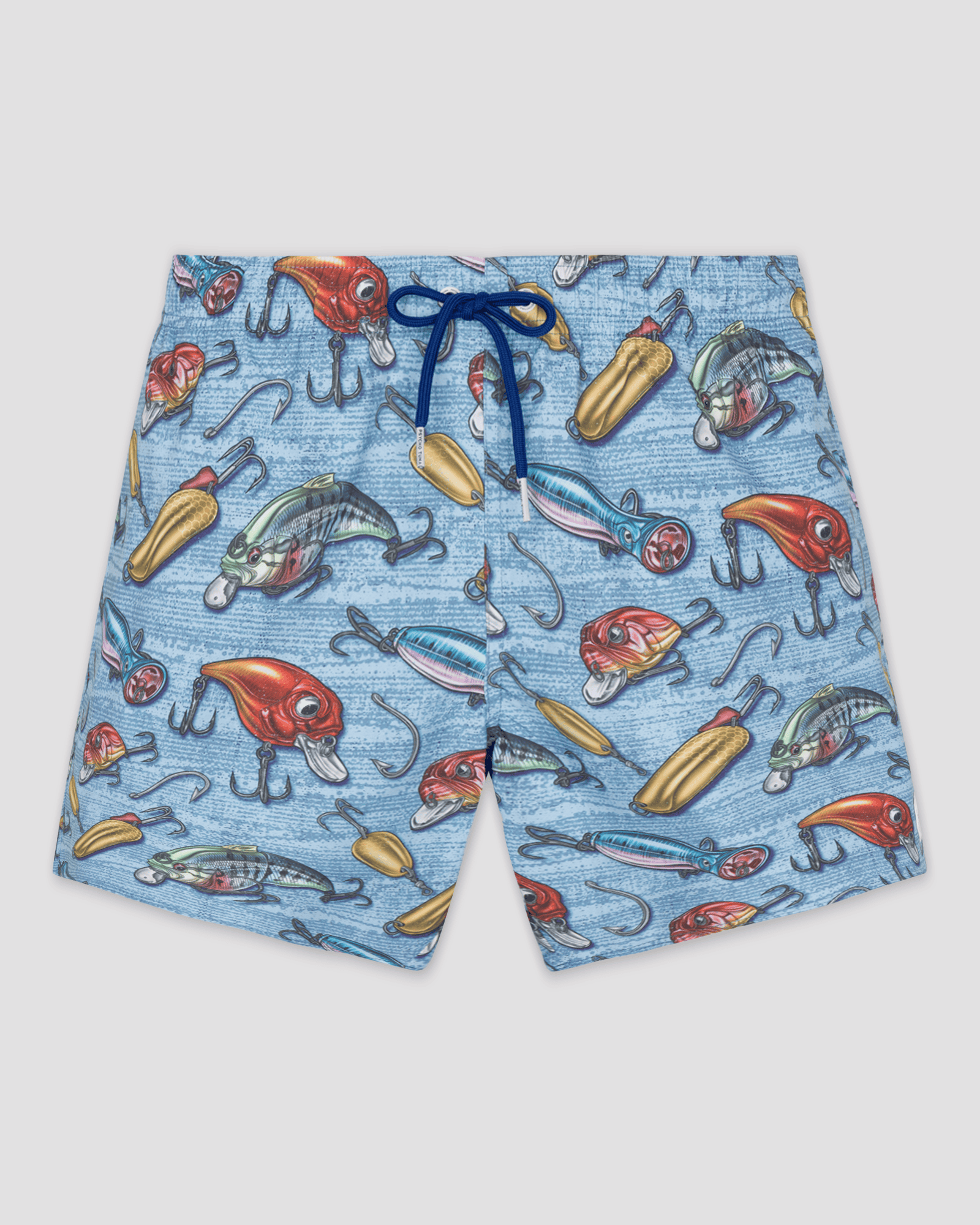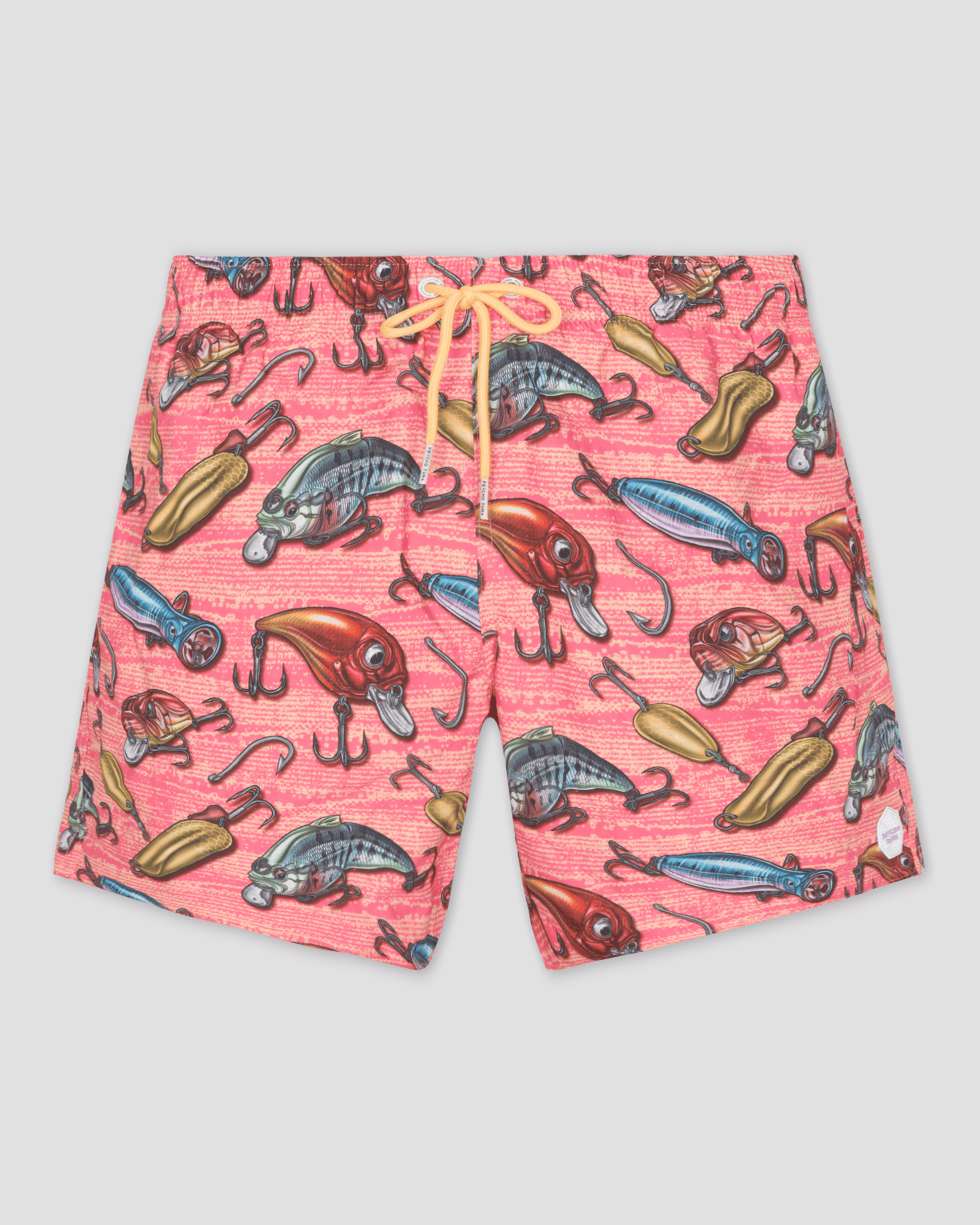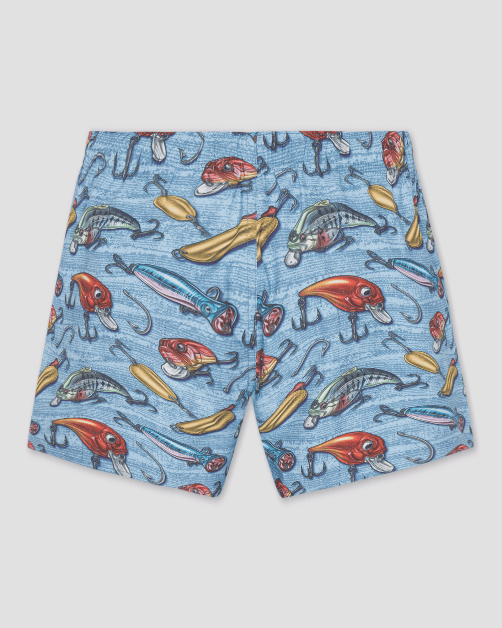 These pool shorts feature an all-over print of original hand-drawn graphic artwork showcasing a variety of fishing lures, each design more eye-catching than the last. The vibrant, detailed illustrations capture the essence of the ocean, making these shorts a standout choice for any beach or poolside adventure. Crafted for comfort and durability, they offer a perfect blend of style and functionality, ensuring you stay cool and look rad while catching waves or lounging in the sun.