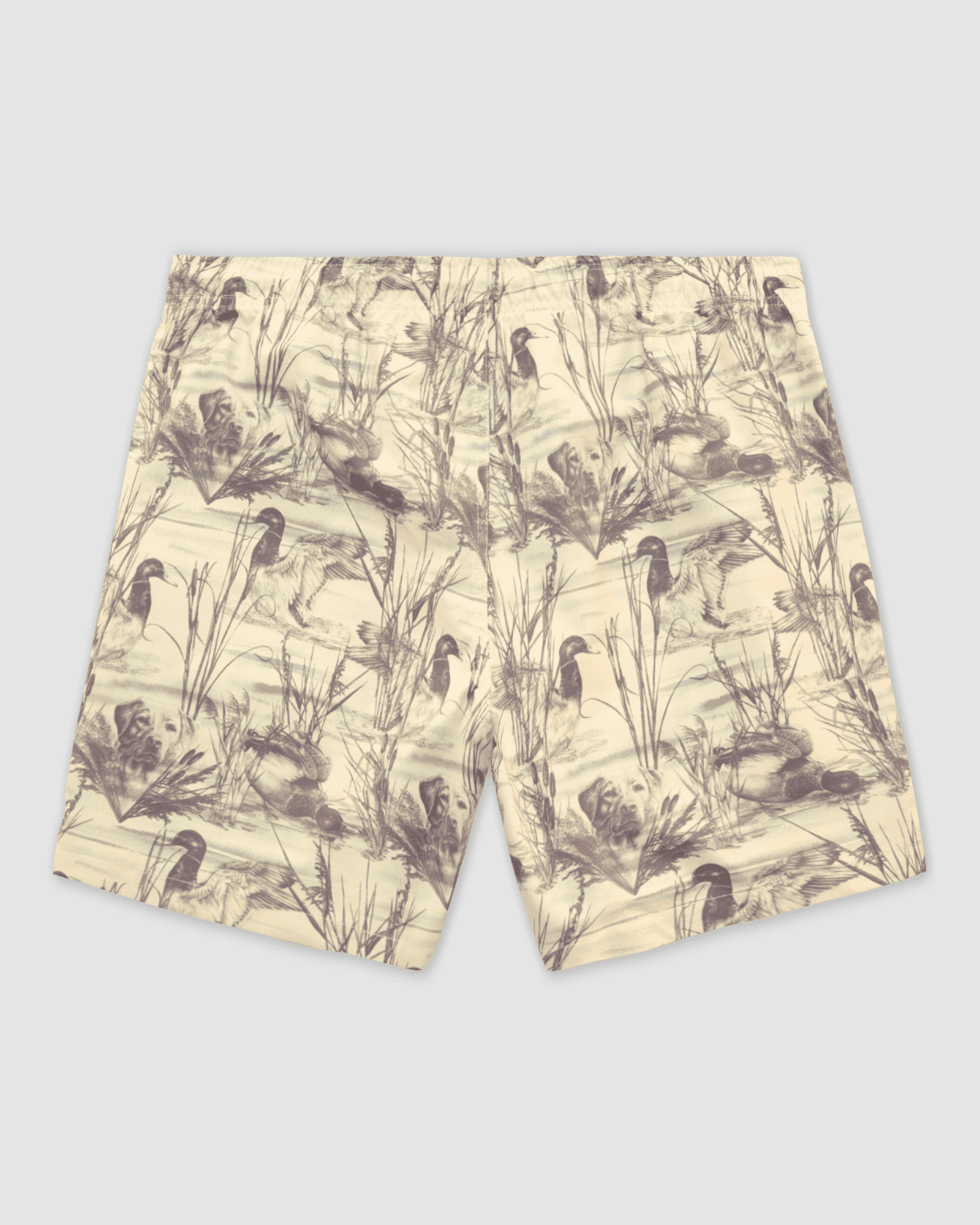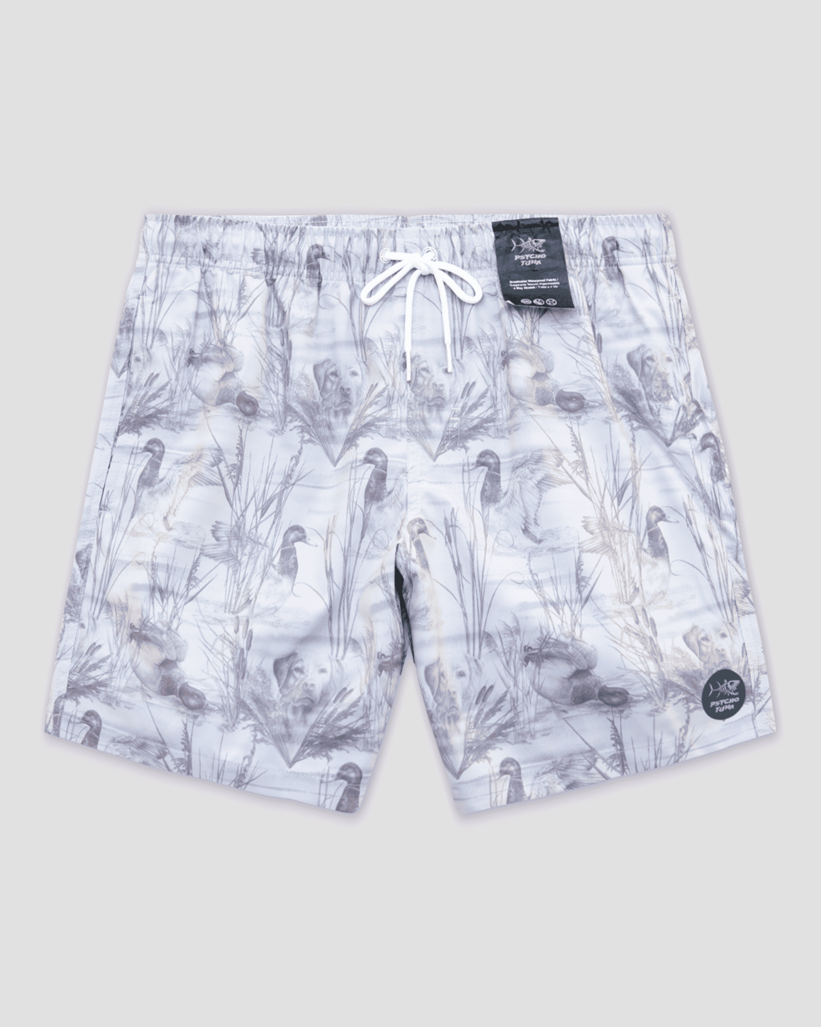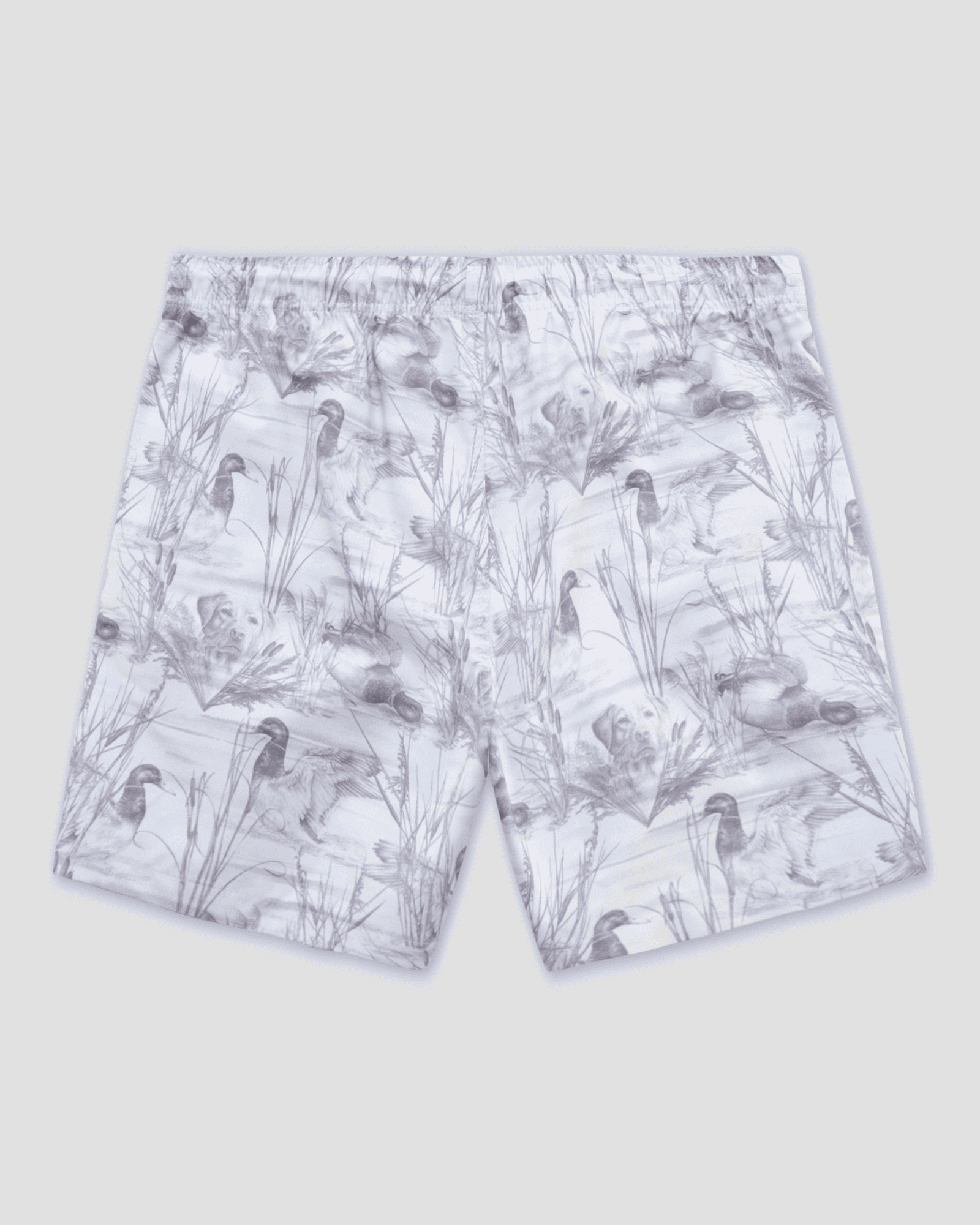 These pool shorts feature an all-over print of original hand-drawn graphic artwork, showcasing ducks gracefully gliding across a serene pond. The monotone drawing style adds a touch of elegance, transforming a simple design into a sophisticated piece of wearable art. Perfect for catching waves or lounging by the pool, these shorts are crafted for those who appreciate unique, high-quality swimwear.