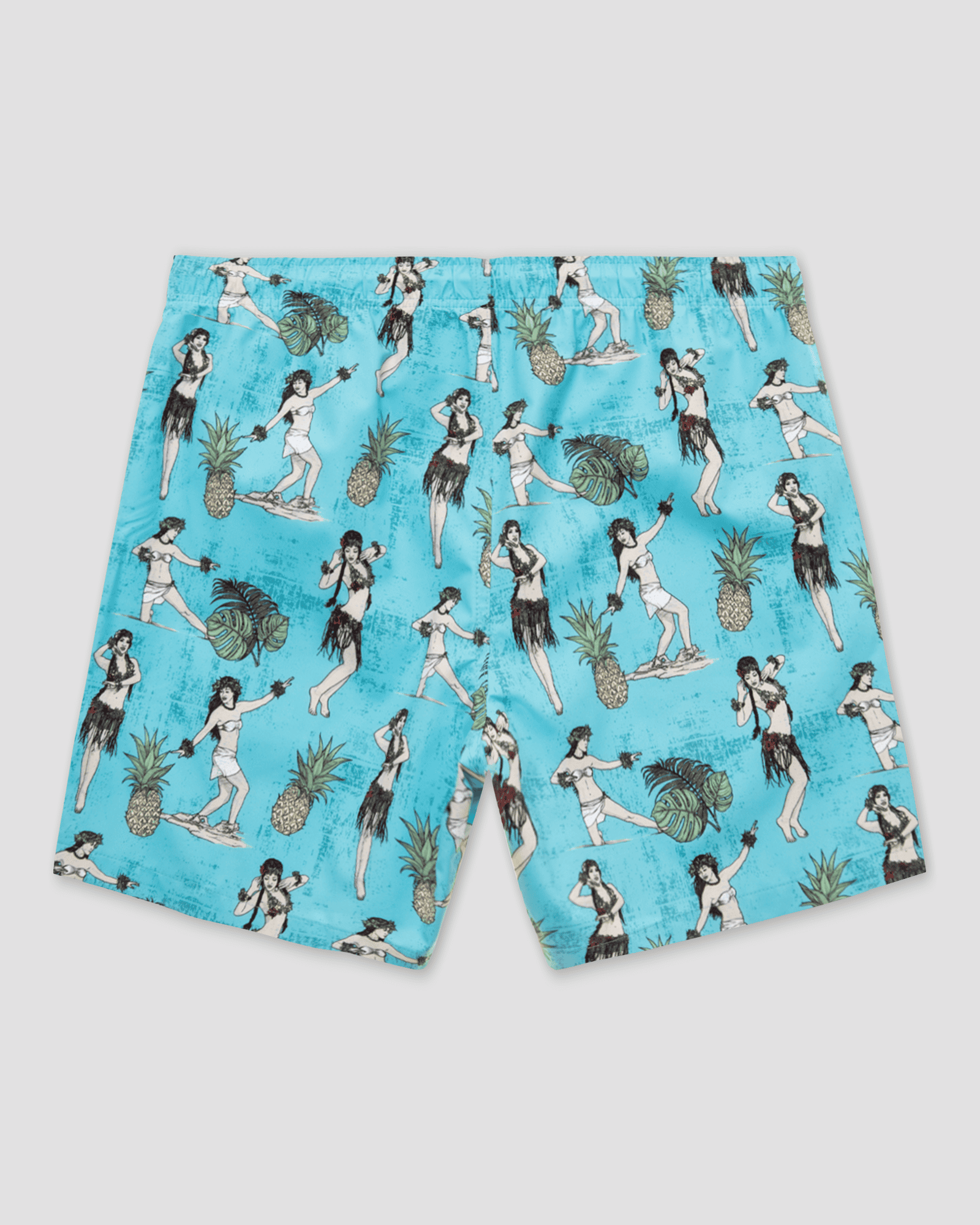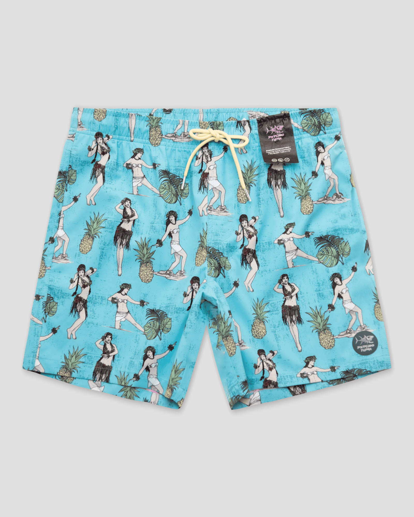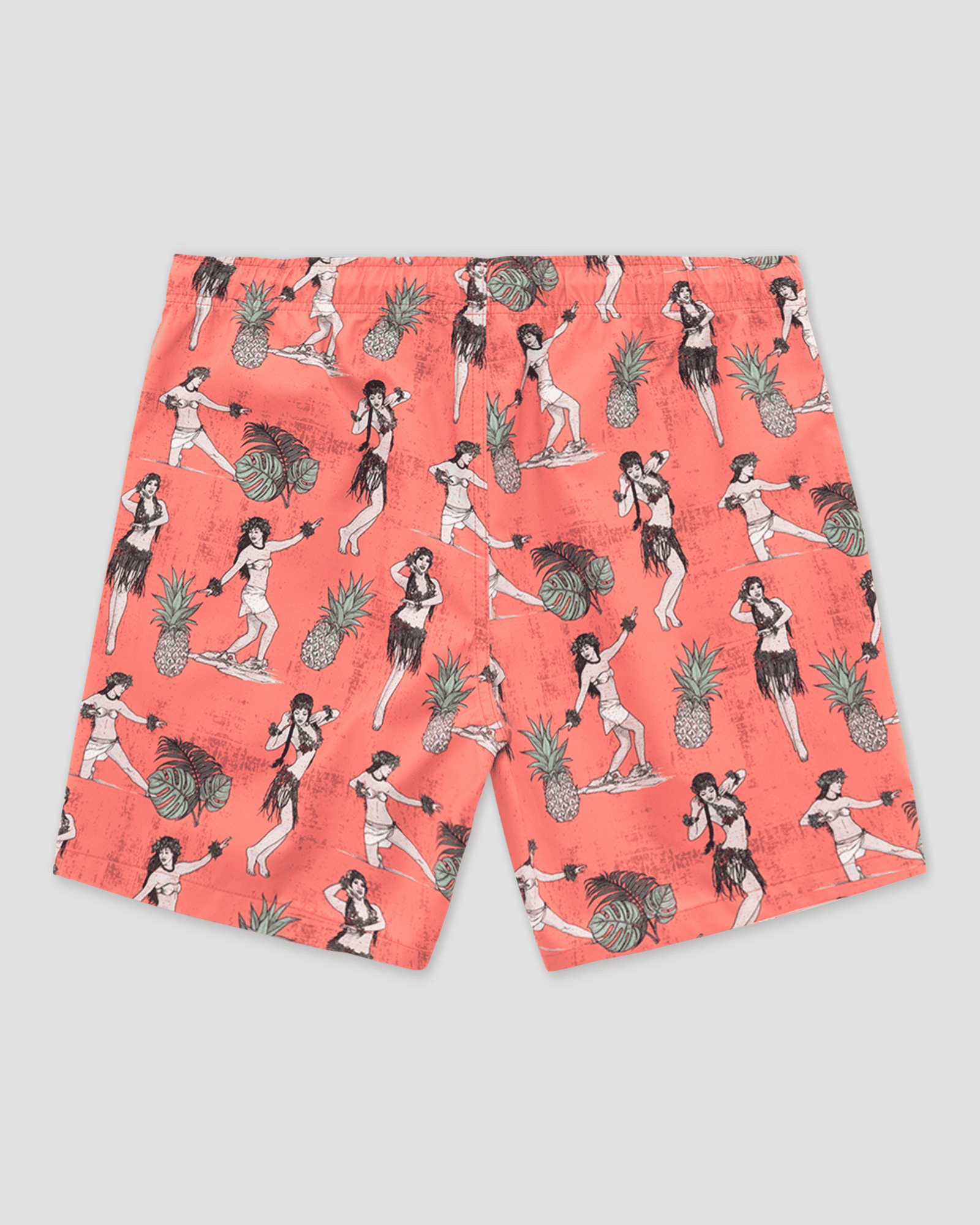 These pool shorts are a must-have for any beach lover, featuring an all-over print of original hand-drawn artwork that captures the essence of Hawaiian culture. Each pair showcases hula dancers in a variety of dynamic poses and graceful moves, bringing the spirit of the islands to life.