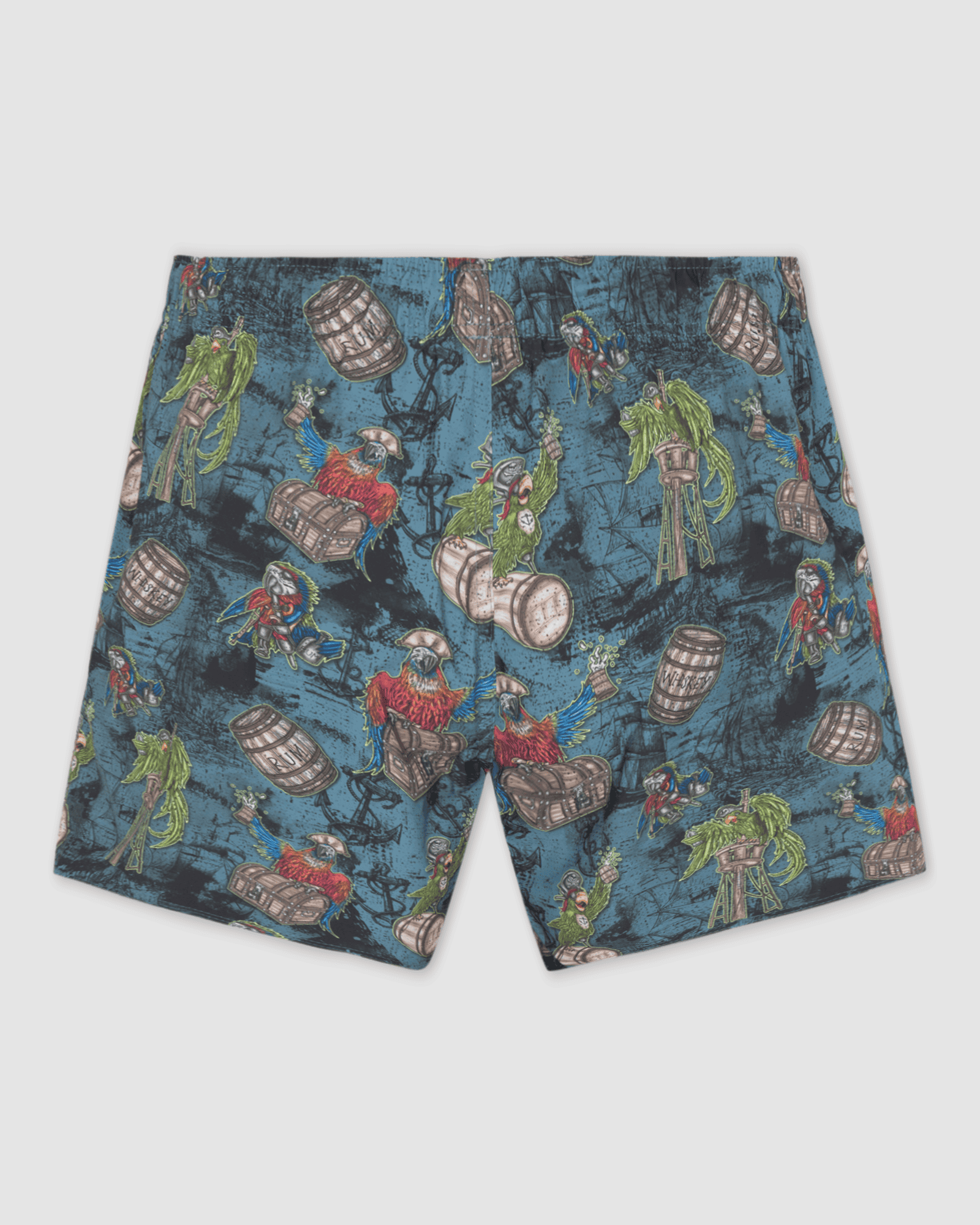These pool shorts are a must-have for any beach bum or poolside adventurer. Featuring an all-over print of hand-drawn pirate parrots, treasure chests, and barrels set against a ghostly shipwreck backdrop, these shorts bring a splash of fun and intrigue to your swimwear collection. The vibrant and detailed artwork captures the spirit of the high seas, making every swim an adventure.