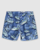 These swim shorts feature an electrifying all-over print of hand-drawn tunas darting through a vibrant, oceanic backdrop. Each tuna is meticulously illustrated, creating a dynamic scene that captures the essence of the ocean’s untamed spirit. The design is not just eye-catching but also tells a story of the underwater world.