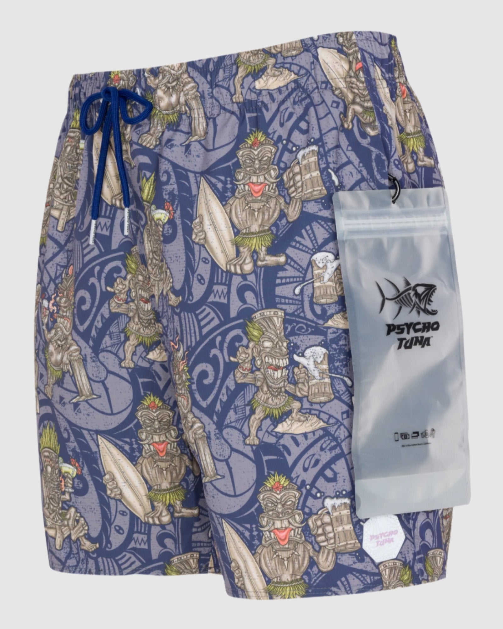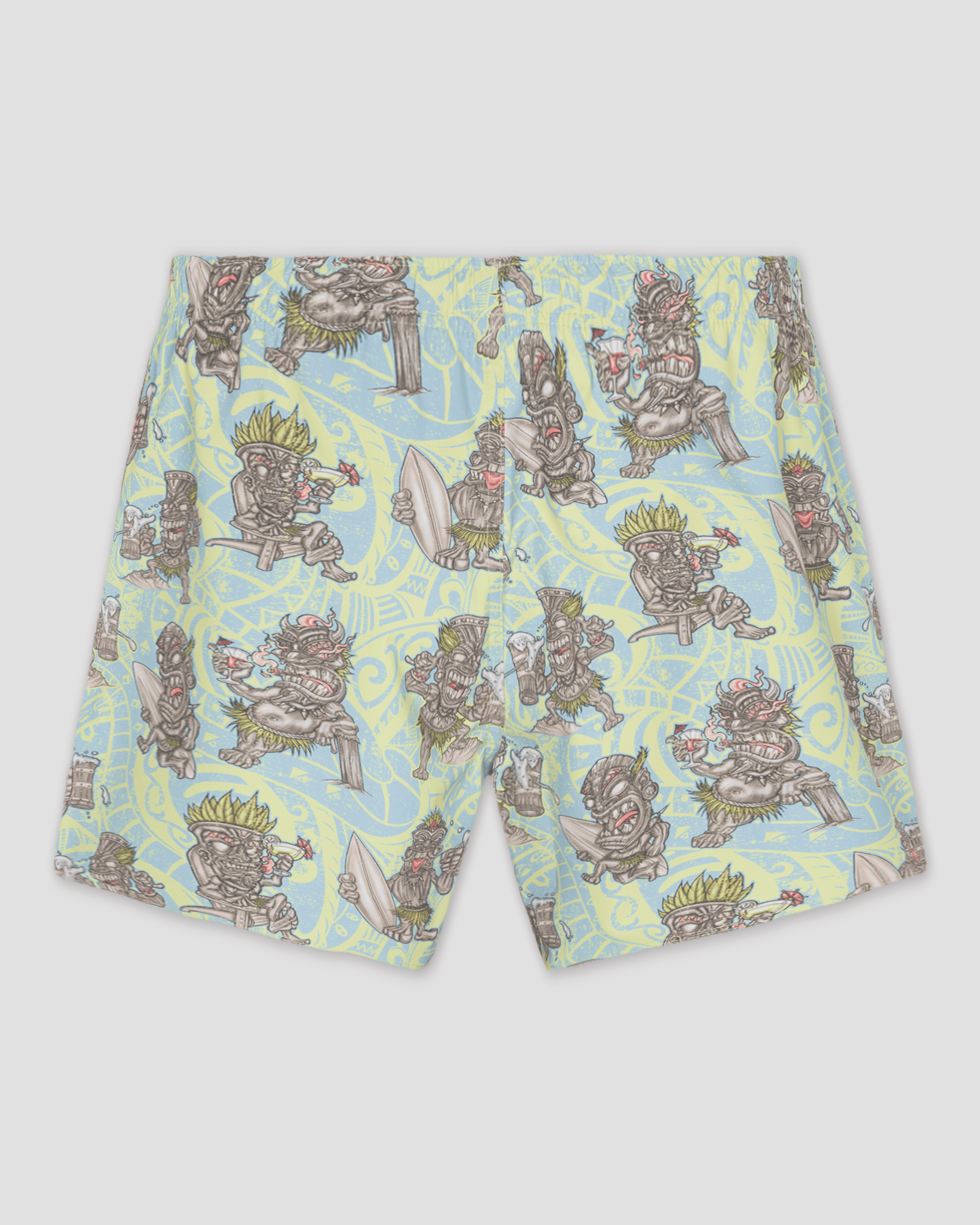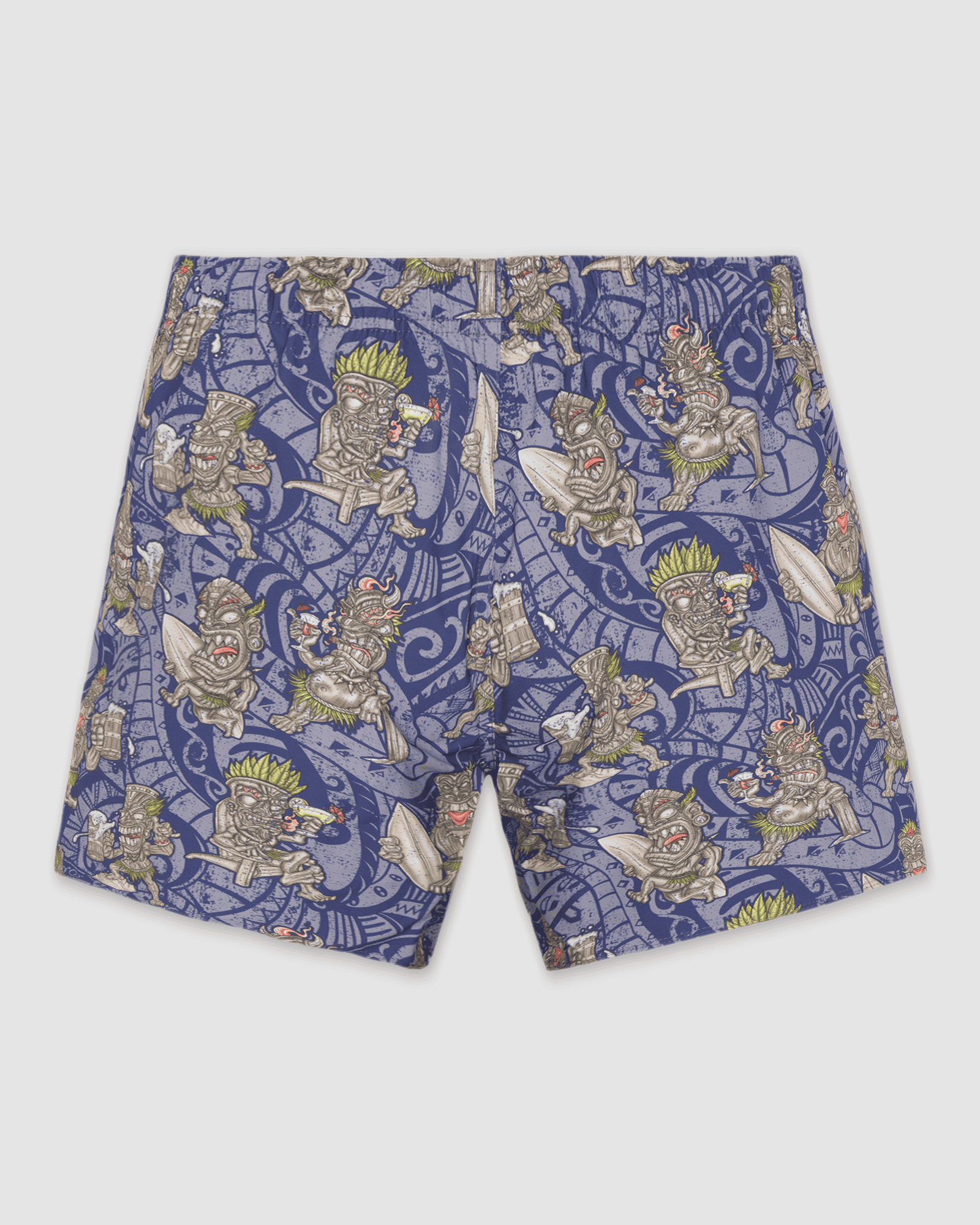 These pool shorts feature an all-over print of original hand-drawn artwork, showcasing tiki warriors in full party mode, clinking drinks and dancing under the tropical sun. The vibrant, detailed graphics capture the essence of a beachside luau, making these shorts a standout choice for any surf enthusiast or beachgoer.