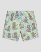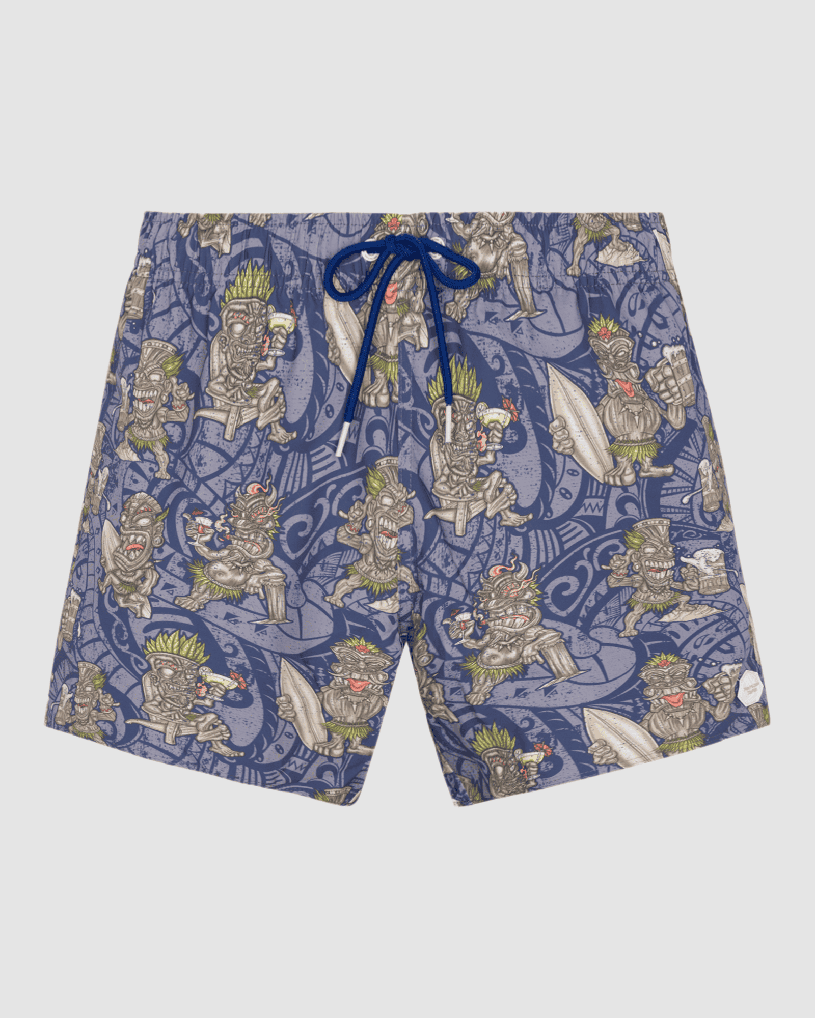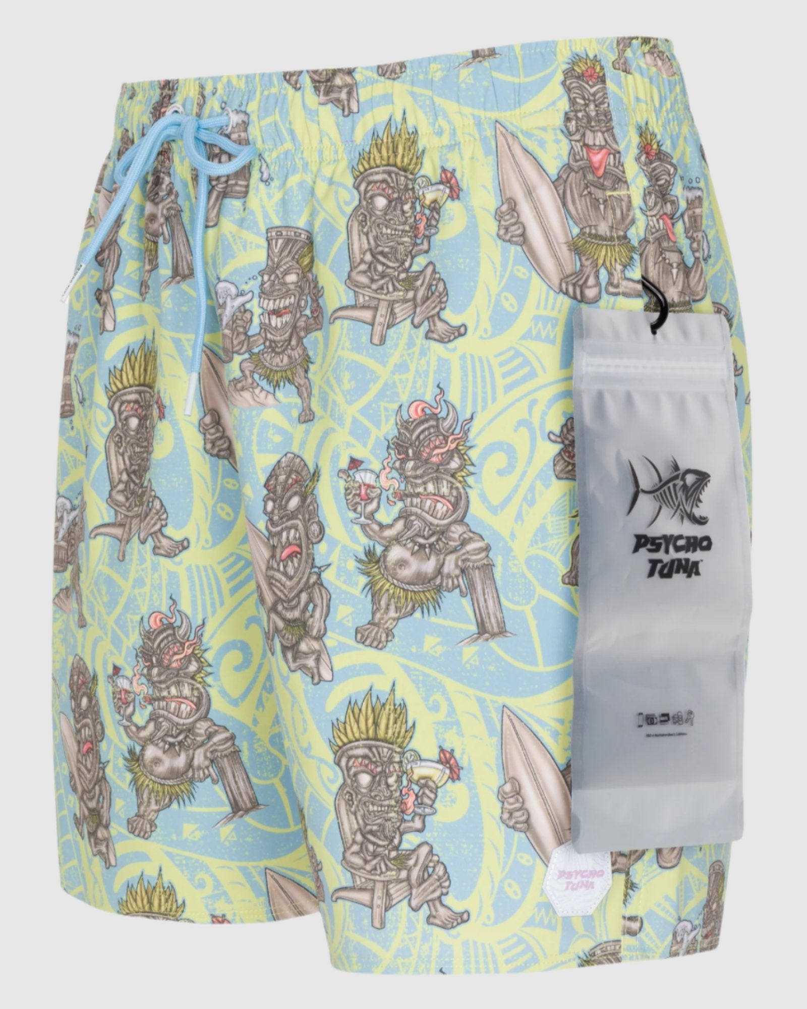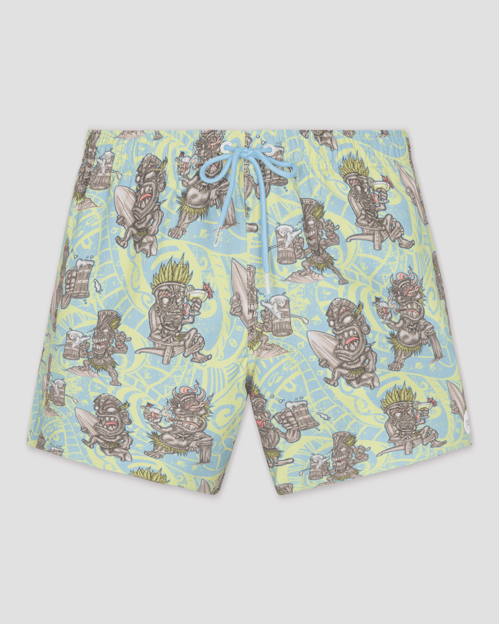 These pool shorts feature an all-over print of original hand-drawn artwork, showcasing tiki warriors in full party mode, clinking drinks and dancing under the tropical sun. The vibrant, detailed graphics capture the essence of a beachside luau, making these shorts a standout choice for any surf enthusiast or beachgoer.