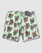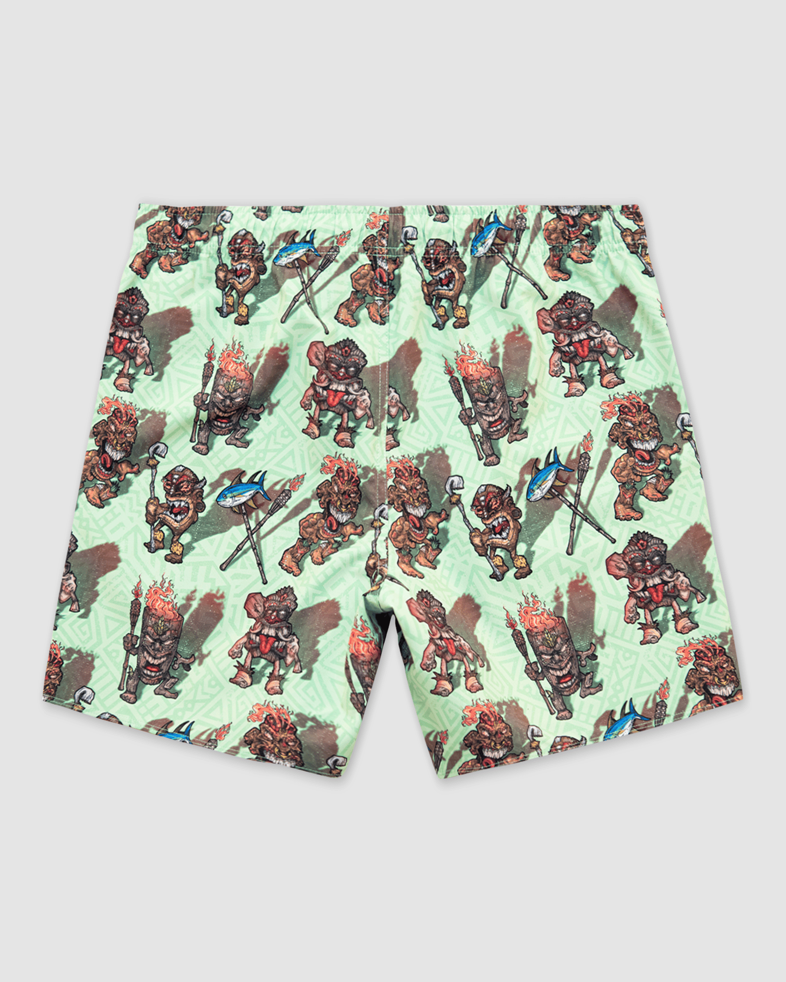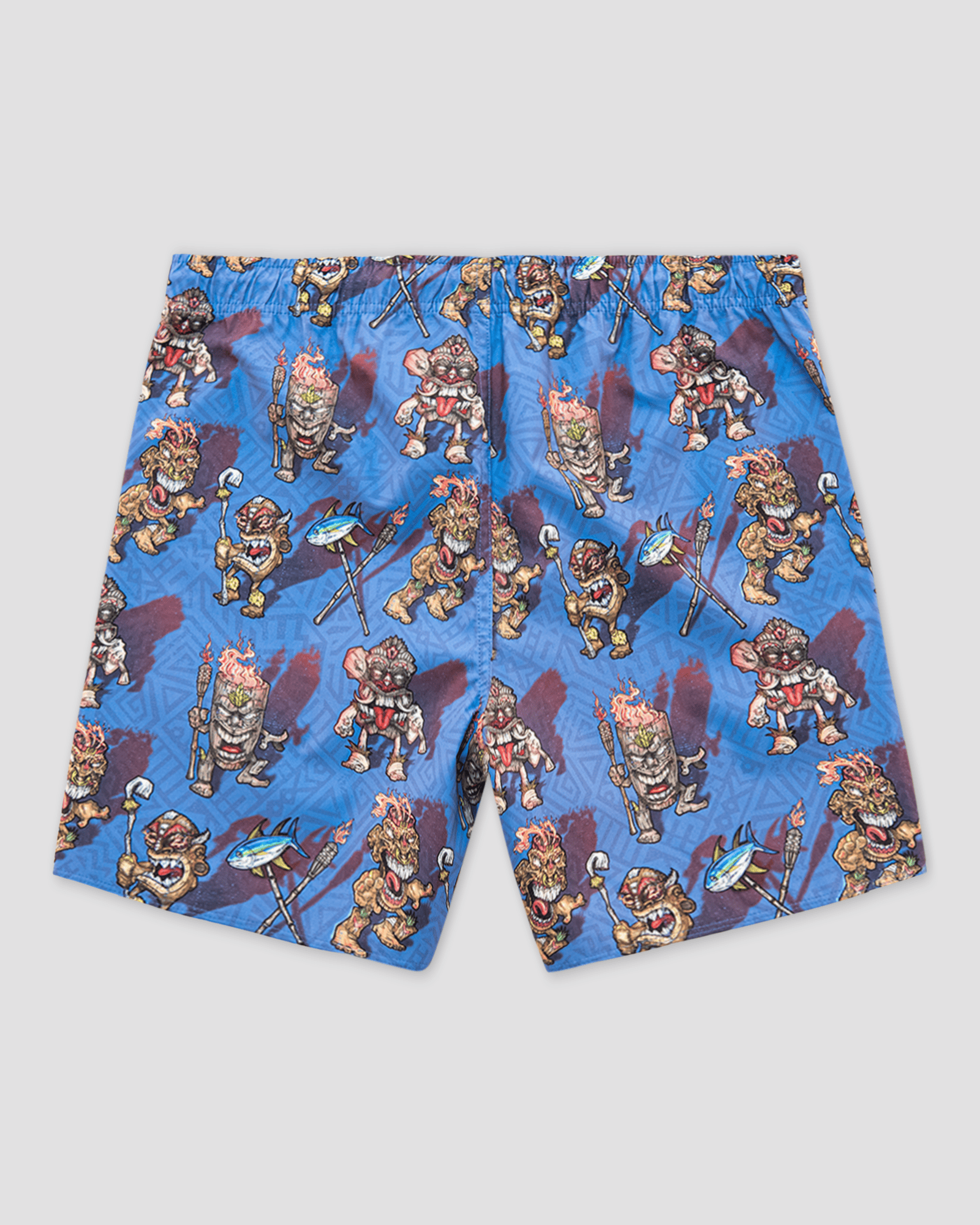 These pool shorts feature an all-over print of original, hand-drawn tiki warriors, each one captured in the midst of a vibrant Hawaiian celebration. The intricate artwork showcases tiki figures dancing, drumming, and reveling in the island spirit, bringing a splash of tropical energy to your swimwear collection. Crafted for comfort and style, these shorts are perfect for catching waves or lounging by the pool.