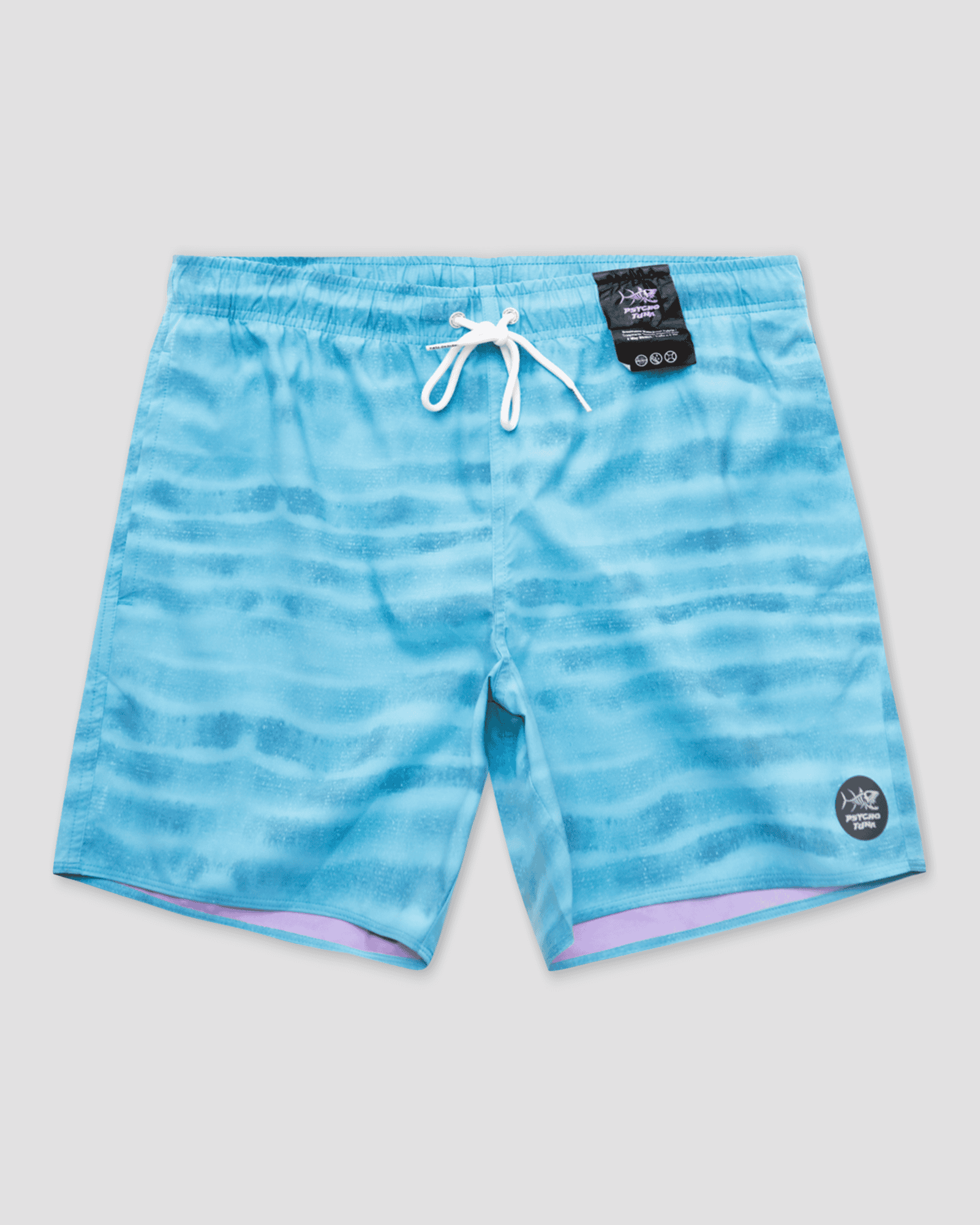These pool shorts feature an all-over print of original hand-drawn artwork, capturing the essence of a sunlit ocean with a mesmerizing wave pattern. The design mimics the fluid motion of water, creating a dynamic and vibrant backdrop that stands out both in and out of the pool.