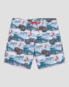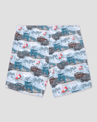 These pool shorts feature an all-over print of hand-drawn beach cruiser cars parked by the lifeguard station, capturing the essence of a sun-soaked day at the beach. The vibrant artwork brings to life the laid-back vibe of classic surf culture, making these shorts a must-have for any beach lover.