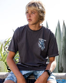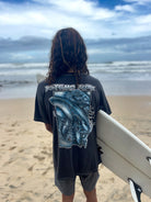 Short Sleeve Tee featuring hand drawn artwork. Super soft pigment dye cotton. Available in White and Lav/Aqua Tie Dye. Screen printed front and back. 100% Organic Cotton. Available in S-M-L-XL-XXL. Made in the USA.