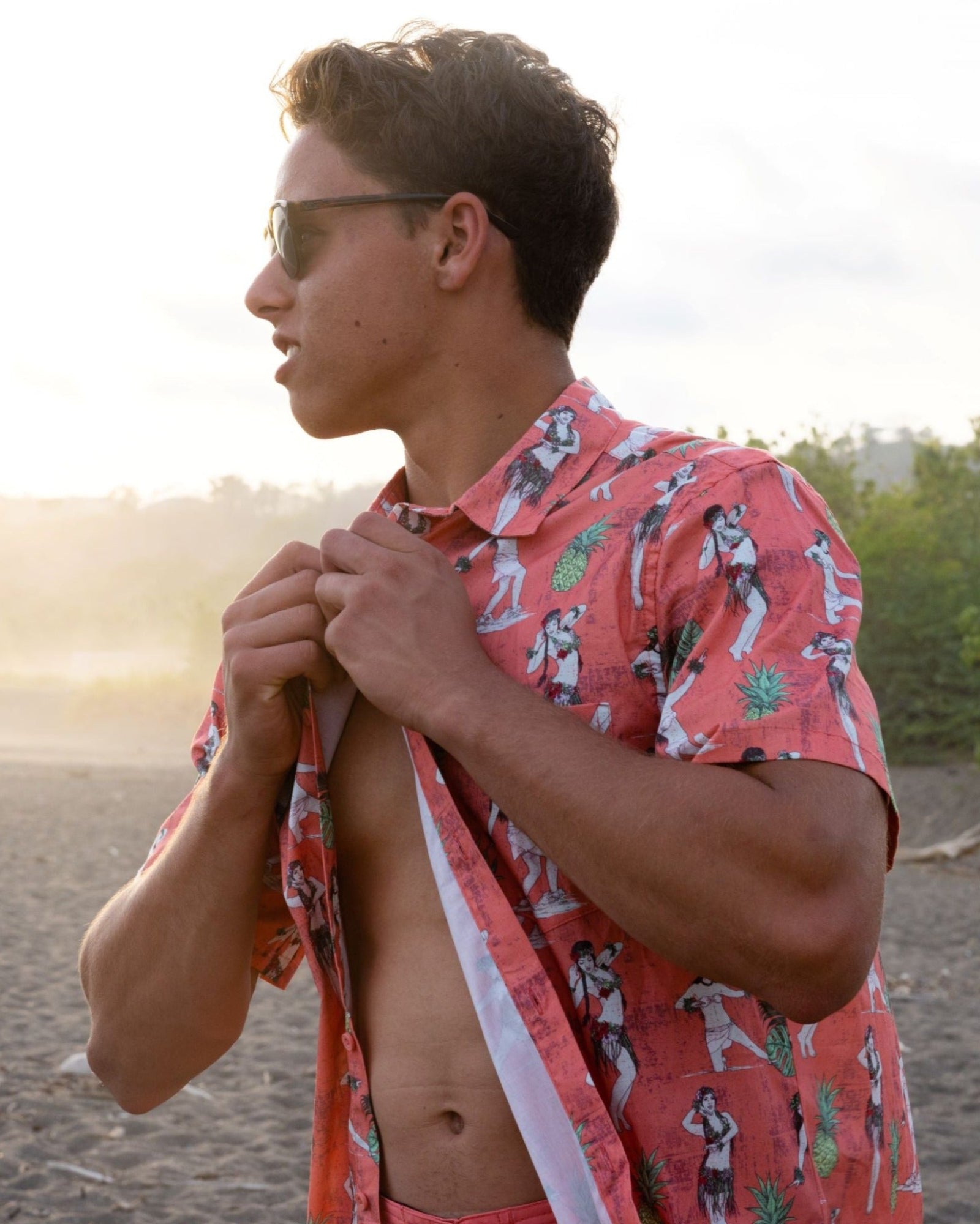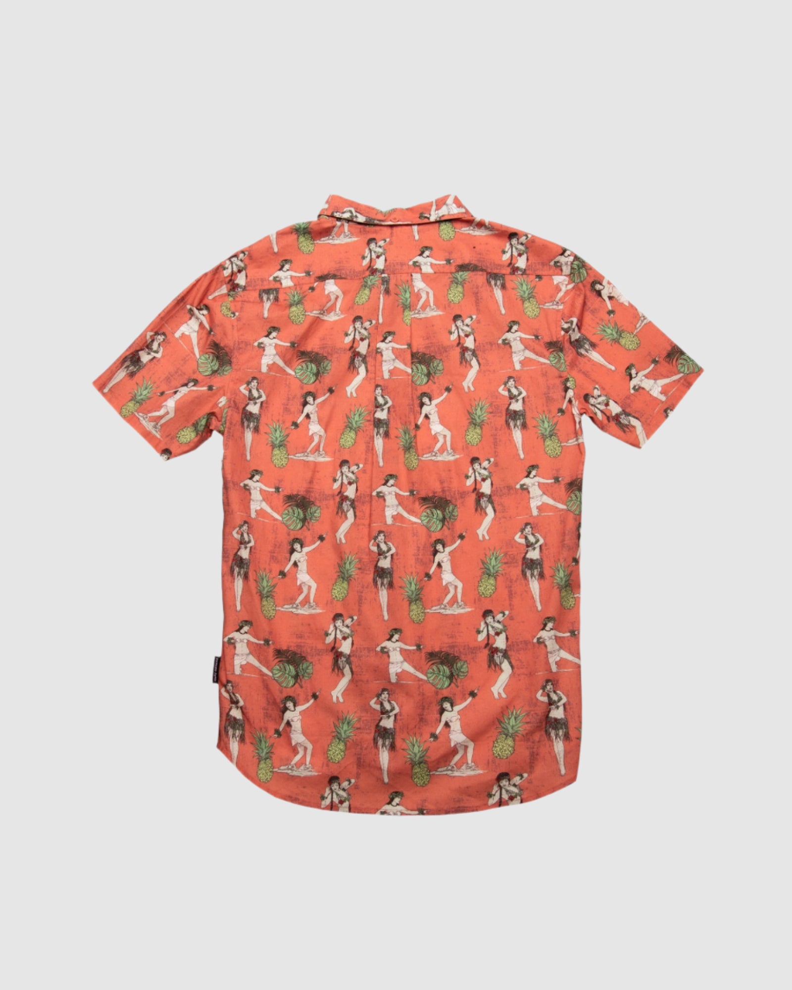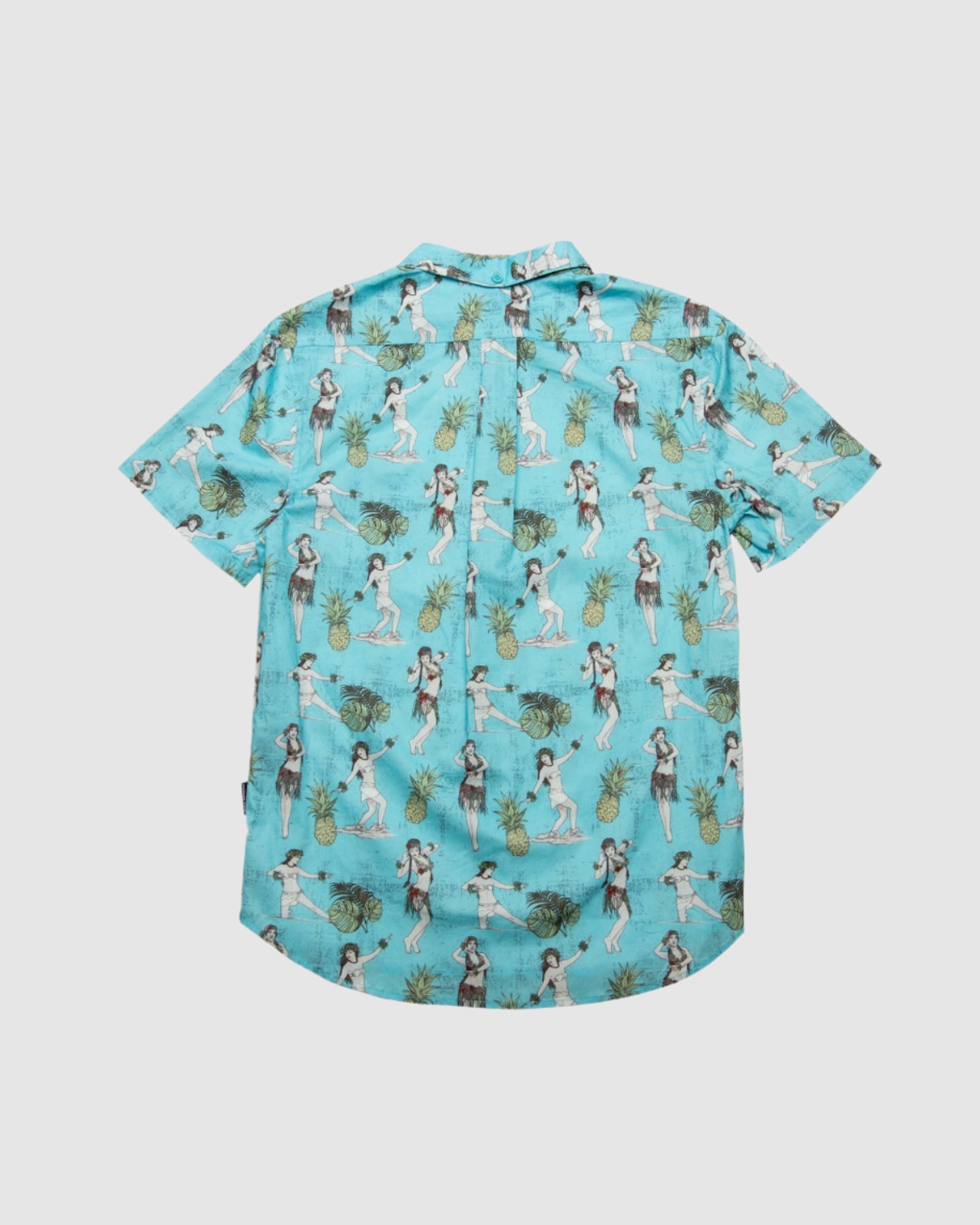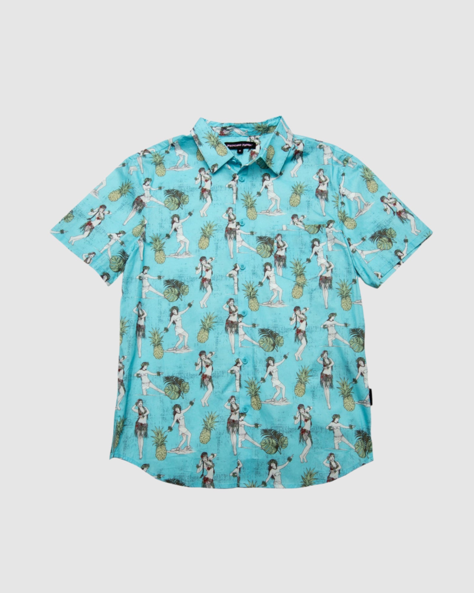 This gnarly shirt is a must-have for any beach bum or surf enthusiast. The full-on print features hand-drawn graphic art of Hawaiian hula girls, leaves, and pineapples, creating a vibe that’s totally tubular.