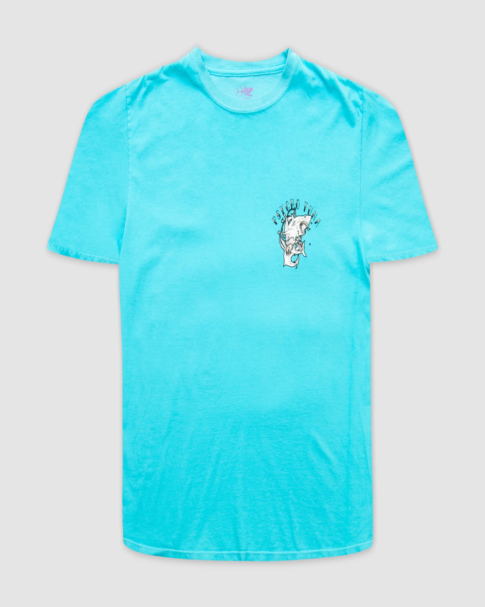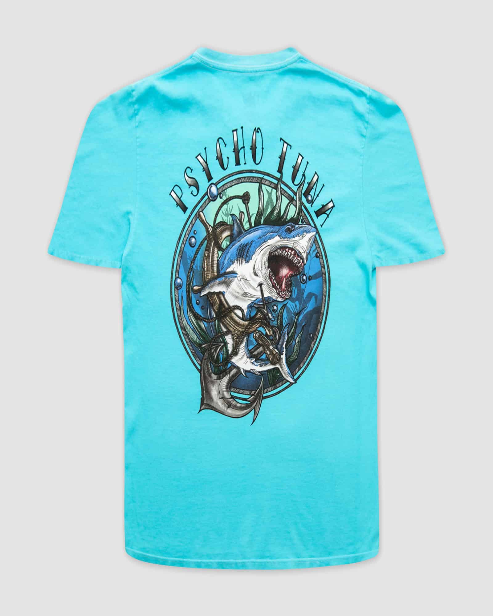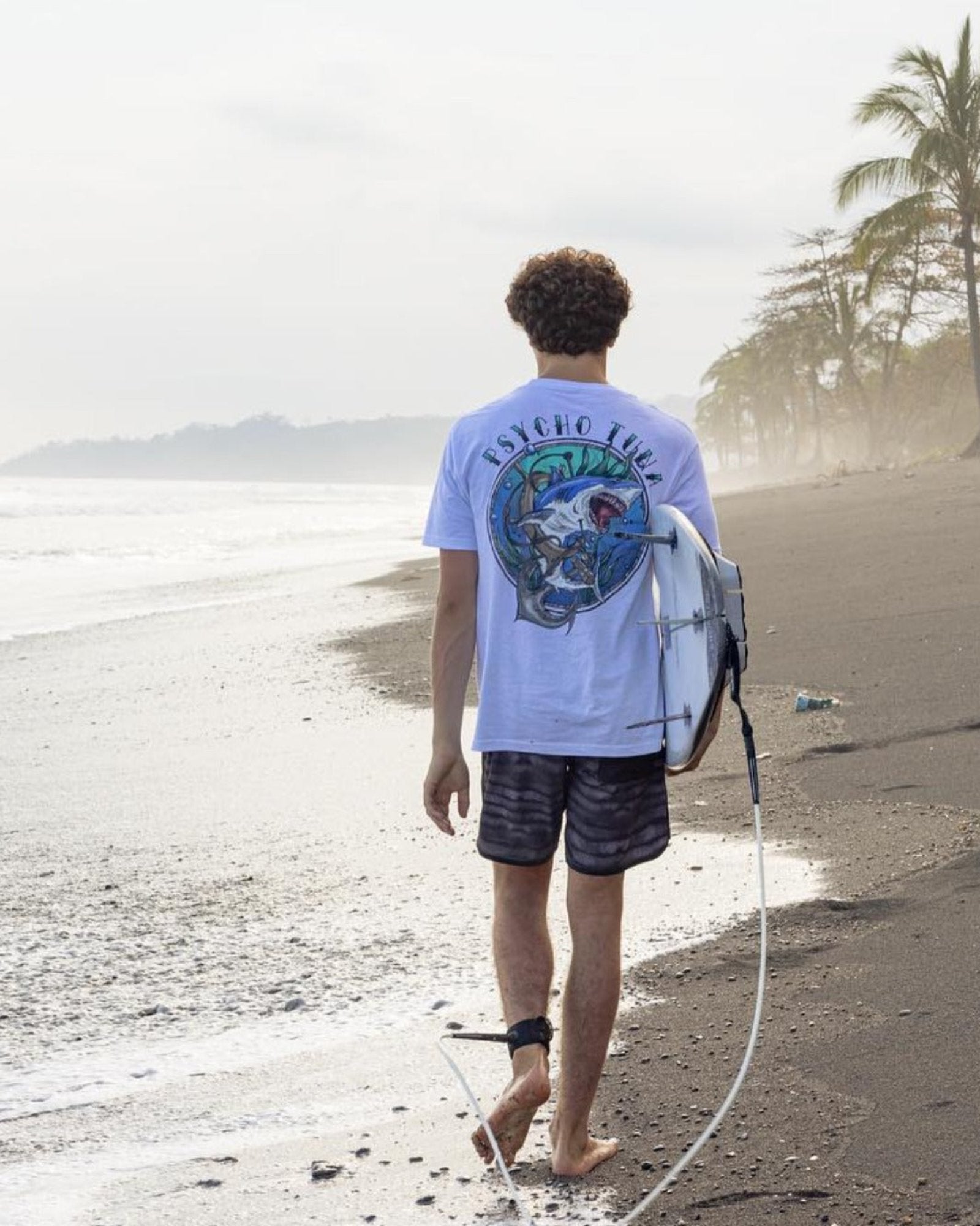 The Shark Bite tee delivers an incredible hand-drawn print. Available in Blue Radiance and White. Screen printed. 100% Organic Cotton.