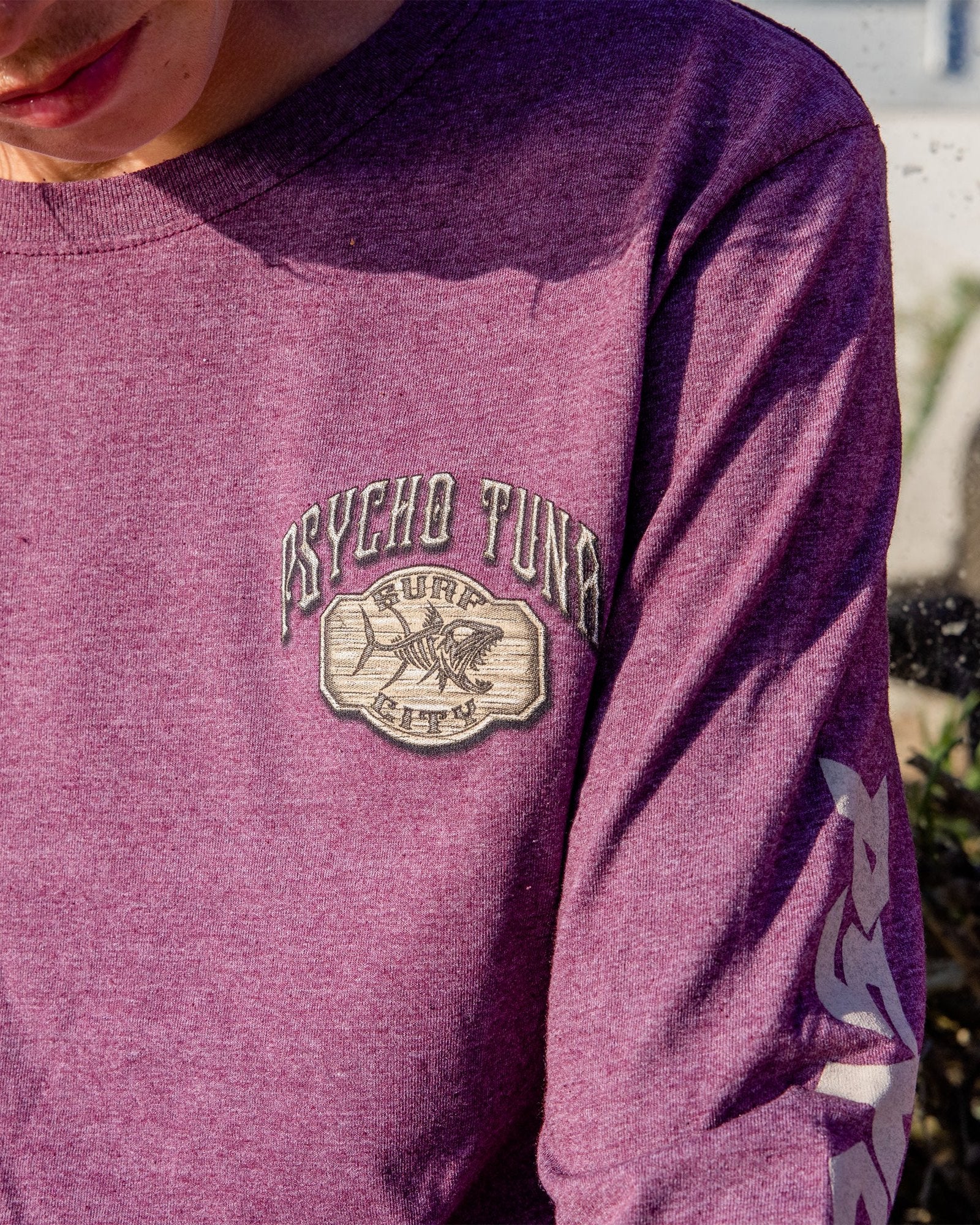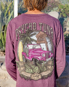 Welcome to Surf City USA. Long Sleeve. Featuring hand-drawn artwork. Super soft pigment dye cotton. Available in Dark Olive. Screen printed front and back. 100% Organic Cotton.