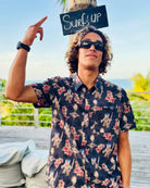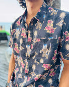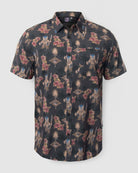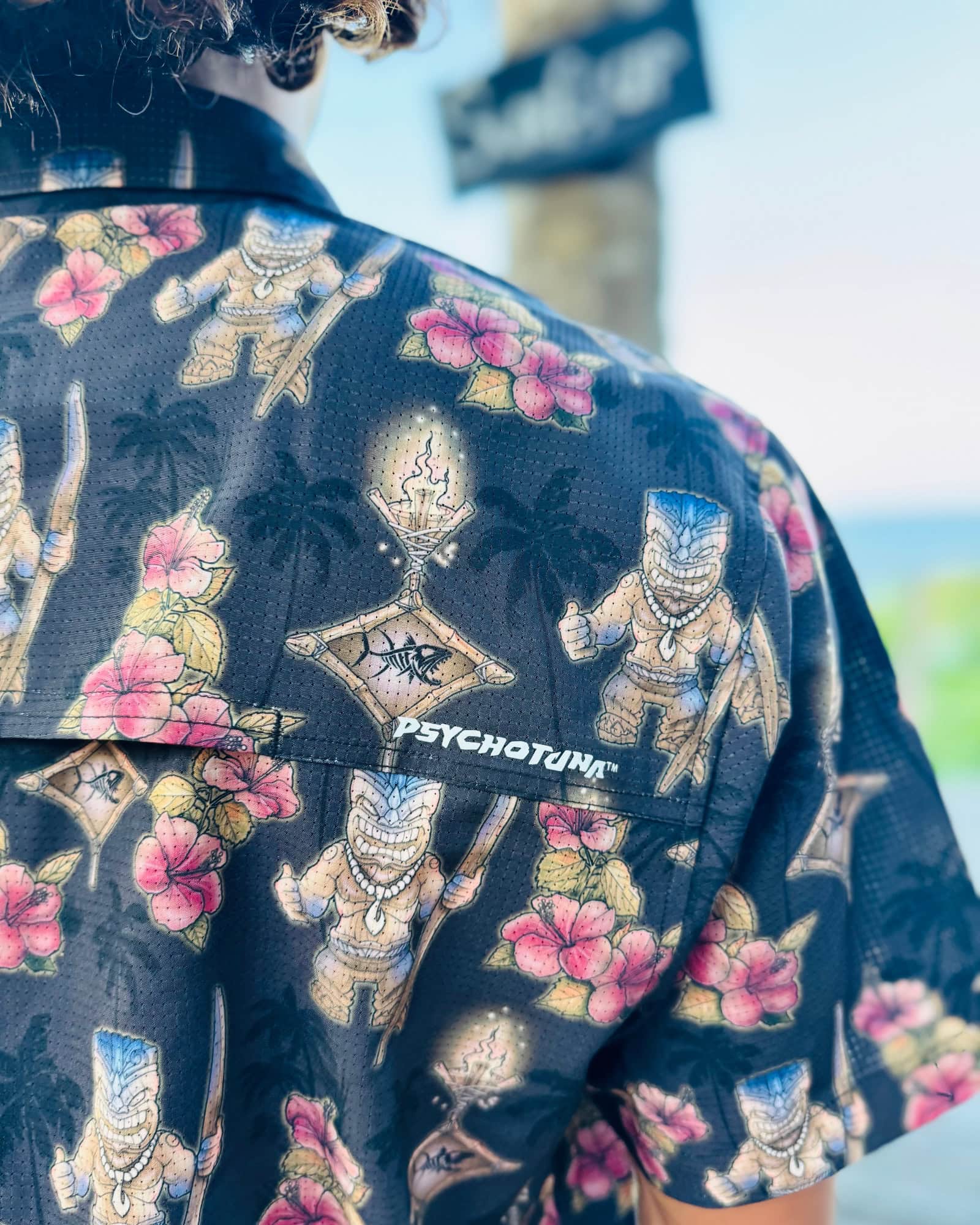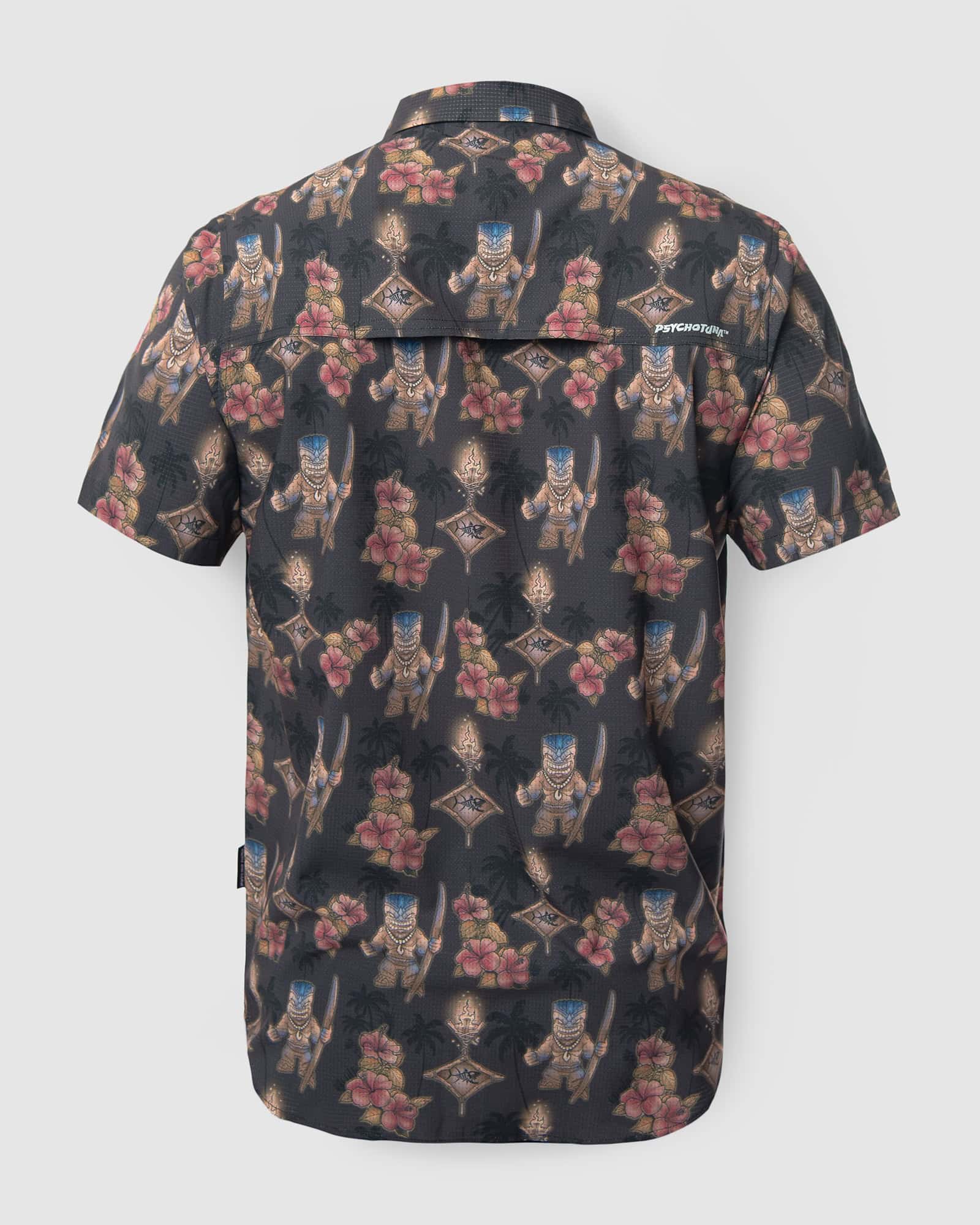 The Torched Short Sleeve Button Up brings bold island style to any wardrobe. Featuring an all-over print of tiki warriors, flaming torches, hibiscus flowers, and palm silhouettes, this design captures the essence of Polynesian culture. Its lightweight, breathable fabric ensures all-day comfort.