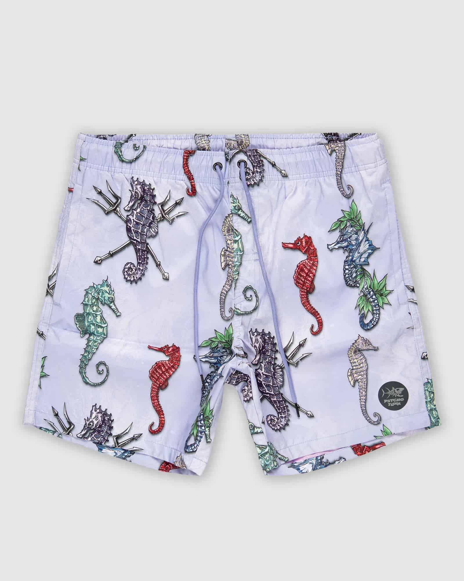 These rad swim shorts feature an epic all-over print of hand-drawn seahorses and tridents, bursting with vibrant colors against a solid backdrop. The unique design captures the essence of the ocean, making you stand out whether you’re catching waves or chilling by the pool.